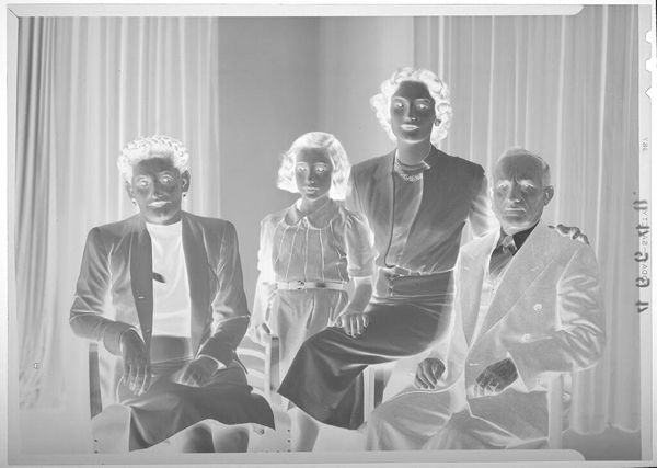 Editor: This is "Untitled (portrait of man and three girls)" by Lucian and Mary Brown, its date is unknown. It's a small photograph. There's something eerie about it, perhaps because it's a negative. What symbols do you notice in it? Curator: Notice the repetition. Three girls, almost a visual echo, suggesting lineage and continuation. The man, possibly a father, is presented in the material symbols of the domestic space: a lamp, a table, a picture. He is the stable figure in this image. How do these symbols speak to societal roles or expectations? Editor: It's like the setting is a stage for a family portrait. The man is very present, almost fixed, while the girls look transient. Curator: Exactly! In family portraits the poses suggest status or position within the family. They become like secular icons. I wonder about the psychological dynamic that emerges from those choices. Editor: I didn't realize how much a simple family portrait could communicate! Thanks for that. Curator: My pleasure! It's always a thrill to decode the hidden language in images.