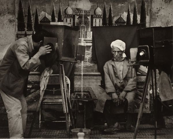 Curator: This arresting snapshot by Jack Gould, simply titled "Untitled (firemen eating at table, served by women)," captures a domestic scene that feels both familiar and otherworldly. Editor: The inverted tones lend it a ghostly quality, don't they? It evokes the kind of eerie stillness you find in dreams, amplifying the gendered divisions it depicts. Curator: Indeed, there’s a potent tension. We see the firemen at the table, these figures of public heroism, being tended to by women whose labor is unseen, assumed. It speaks volumes about social expectations. Editor: Precisely. The photograph subtly exposes the way society often relegates women to the domestic sphere, even while celebrating men's contributions in the public realm. This makes me wonder: was Gould aware of this commentary? Curator: Perhaps consciously, perhaps not. But art often holds a mirror to society, reflecting back what is, even when we don't fully grasp its implications. The everyday can be surprisingly profound. Editor: Absolutely. This small image really packs a punch, prompting us to consider the power dynamics embedded in the simplest of scenes.