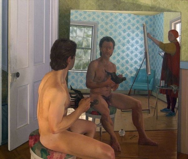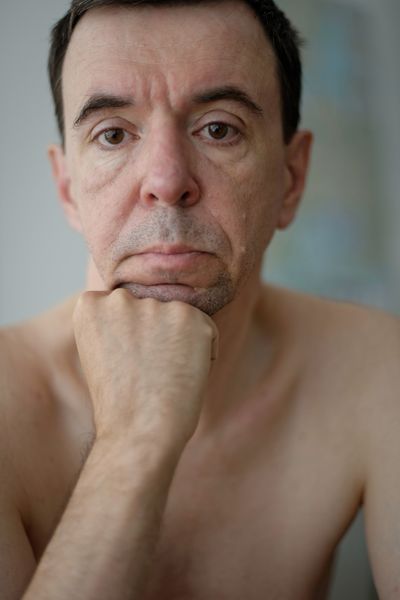 This is a photograph by Elina Brotherus, and it features a man with a sleeping puppy on his lap. The image immediately calls to mind classical depictions of tenderness and care, motifs that have been explored across centuries. Consider, for example, the Madonna and Child, where the act of holding a child embodies maternal love and protection. Here, the man's gentle hand resting near the puppy mirrors that nurturing gesture, albeit in a markedly different context. The intimate act of a human and animal sharing such a quiet, vulnerable moment can be traced back through various cultural representations, from ancient Egyptian depictions of deities with animal companions to Renaissance paintings of saints with their animal familiars. The image taps into our collective memory, stirring subconscious connections to themes of guardianship, affection, and the harmony between humans and nature. This simple photograph thus resonates with deep-seated emotional and cultural narratives. It is a contemporary echo of age-old themes, reminding us of the cyclical return and reinterpretation of fundamental human experiences.