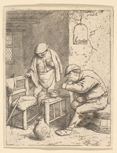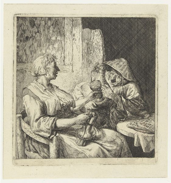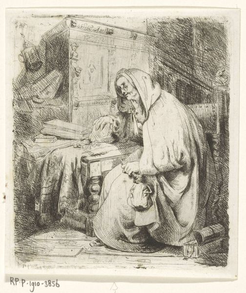 Reinhard Voskens created this small print of a seated woman during the Dutch Golden Age, using the technique of etching. A copper plate would have been coated with a waxy ground, and then the image scratched into it with a needle, exposing the metal. The plate was then immersed in acid, which bit into the lines, creating grooves that could hold ink. The resulting print shows an elderly woman at work, perhaps mending clothes. It’s a humble, everyday scene. The etcher’s line is economical but expressive, giving a strong sense of the textures of cloth, wood, and even the light filtering through the window. We can imagine the artist carefully controlling the acid bath to get just the right depth of line. What I find really compelling here is the convergence of artistic skill and the representation of labor. Voskens elevates the ordinary work of this woman by depicting it with such care and attention. It reminds us that all making has dignity, whether it’s a fine art print or a humble piece of needlework.