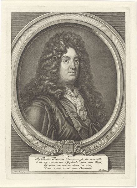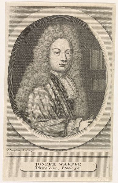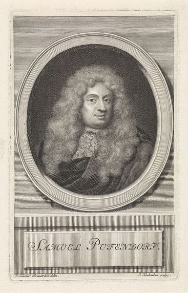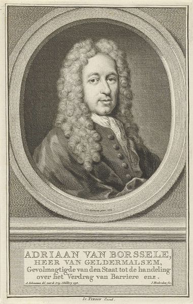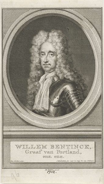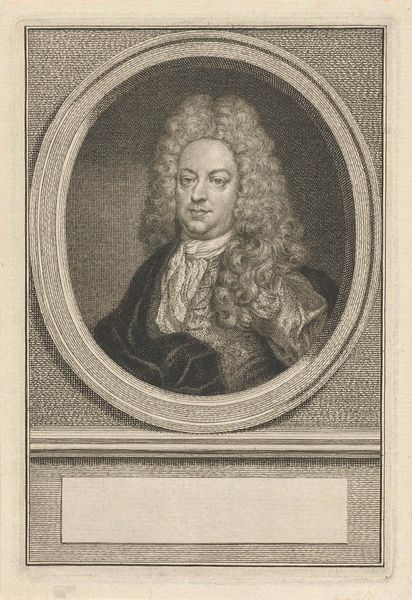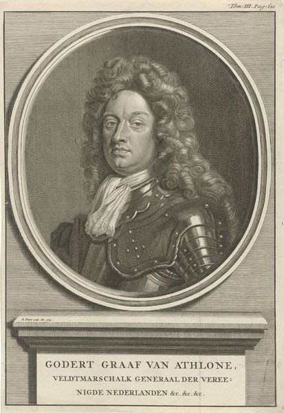 Curator: This is a portrait of Adolf Hendrik van Rechteren, crafted by Jacob Houbraken between 1747 and 1759. It is currently held in the Rijksmuseum collection. The work is an engraving, offering a window into Dutch Golden Age portraiture traditions. Editor: My initial reaction? An incredible demonstration of texture, achieved through the demanding craft of engraving! Look at the swirling, almost overwhelming wig against the smooth armor. It's all lines and their masterful arrangement. Curator: Absolutely. Engraving served as a primary method for disseminating images during this period, particularly portraits that solidified social standing. It’s a carefully constructed image designed to convey authority and nobility. Consider the cultural weight attached to such representations. Editor: The lines are quite precise, which makes you think about the skill and labour required to create such a piece. The production is itself fascinating, mirroring the rise of a Dutch bourgeoisie defining itself through reproduced images alongside commissioned paintings. It speaks to availability of luxury materials, like specialized paper, and skilled engravers for the upwardly mobile social elite. Curator: And look closer – the armour, the lace – are these indicators of military achievement or social position? It’s an interesting question, isn't it? To what extent were portraits such as these propaganda, contributing to a construction of elite identity. The image clearly leans on visual cues and embedded social codes. Editor: I think the key is how effectively Houbraken's labour highlights material details that are more about conveying social power through surface sheen rather than simply creating resemblance. A certain quality of ink, the pressure and definition of line, is clearly for displaying access to luxury, transforming even basic material into an aesthetic representation. Curator: Reflecting on this image, it underlines the role that artistic mediums played in building social identities, where art actively constructed and promoted concepts of prestige. Editor: For me, examining the means of this portrait's making reveals not just an individual likeness but also illustrates the mechanics behind art in fostering cultural status within a precise historical and material context.