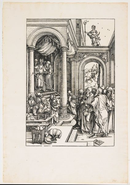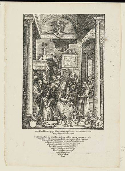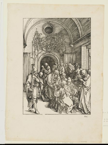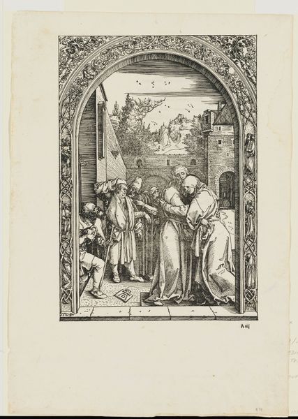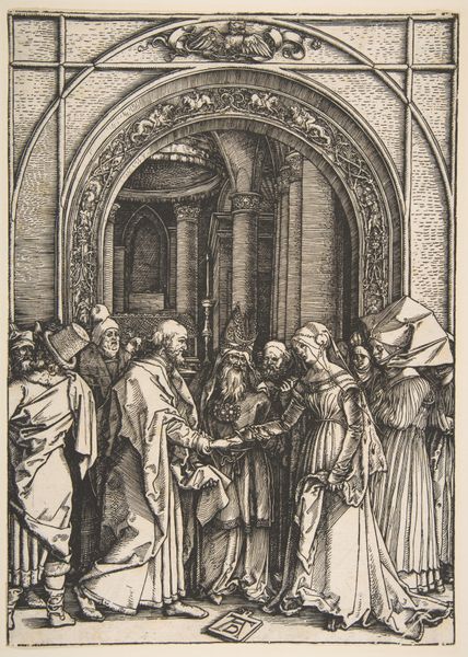 Albrecht Durer rendered "The Marriage of the Virgin" using woodcut, a process that allowed for the wide distribution of images during the Renaissance. This work speaks to the era’s deep engagement with religious narratives and the establishment of social order. The print depicts a betrothal scene, steeped in the patriarchal traditions of the time, where Mary is given away, representing both piety and the subjugation of women within the societal norms of marriage. Durer's intricate lines capture the gravity and formality of the moment, yet it's the subtle expressions and gestures that hint at the human dramas underlying the sacred event. Consider how Durer uses his skills to present a pivotal religious story, while simultaneously reflecting the complex negotiations of gender, power, and faith that characterized his society. This piece encourages us to reflect on historical representations of women, while acknowledging the intimate, human aspects of its subjects.