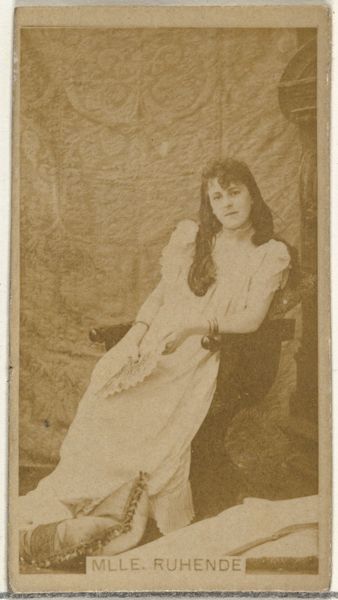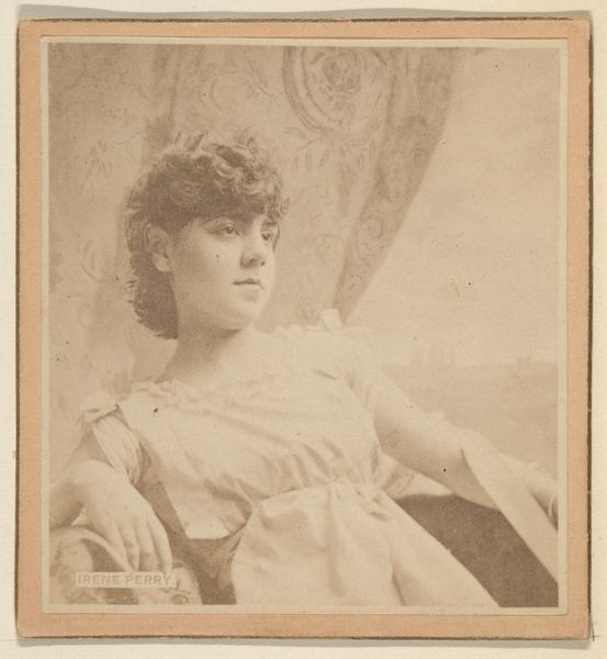 Curator: It has an air of dreamy languor, wouldn’t you agree? The sepia tones and her pose evoke a world of gentle ease. Editor: It's interesting how seemingly benign images like this of Pearl Jackson, an actress from the late 19th century, were used to promote, of all things, Sporting Extra Cigarettes by Kinney Brothers. Curator: Ah yes, from the Actresses series. Type 2, if you are collecting! Editor: Right. These trade cards were essentially advertising ephemera. But, stepping back, aren't they reflective of the commodification of women's images? Placed in the service of capital? Curator: A somber lens! Though she does have such a wistful face, lying there, caught between waking and sleep, and this card a vignette of longing—almost as if plucked from a dream. Editor: That wistfulness likely played right into it. Then, as now, a strategic fantasy; the woman as a thing to be acquired alongside... a smoke. Her relaxed position feels… performative. Curator: Mmm, possibly. The angle is low, emphasizing her face and décolletage. And yet I see softness—an intentional aesthetic, Pictorialist almost in its haziness, a remove from harsh reality? A gentle, romantic appeal. Editor: Agreed, the Pictorialist effect softens the edges of this, lets call it commerce, even aestheticizes it. However, can we separate aesthetics from their societal role? Can we forget about women and objects reduced to consumer bait? Curator: Point taken! But art is often made to persuade and to charm. Commerce can still allow beauty to flourish, no? Is this, I mean, are we seeing an actress, in character or simply posed? It feels deliberately posed for something akin to private enjoyment. Editor: Private enjoyment... made very public via mass distribution! Perhaps that is where some tension lies; a public depiction with carefully-placed intimacy, promising to anyone, if you will but buy something... Curator: Indeed, what once felt simple now holds deeper shadows and lights. Editor: Absolutely. Examining popular visual forms such as this commercial image grants perspective regarding their contribution towards enduring modes of social hierarchy, commodification and sexism.