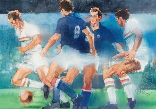 Renato Guttuso, born in Sicily in 1911, painted "I calciatori," or "The Football Players," capturing the raw energy of a soccer match. His work often intersected with his political beliefs, developed during the fascist regime in Italy. Guttuso had a commitment to social realism, and he channels that here. The players in the painting aren't idealized; their bodies are rough, their movements intense. The vibrant colors and bold strokes convey the physicality and emotion inherent in the sport. Are these gladiators of the modern age? What does it mean to represent athletic, masculine identity so close to a period of war? Guttuso once said, "Painting is a weapon," and here he uses his brush to depict a scene of action, competition, and perhaps, a reflection of the struggles and passions of everyday life. The painting moves beyond the surface of a sports scene, inviting us to consider the deeper currents of human experience.