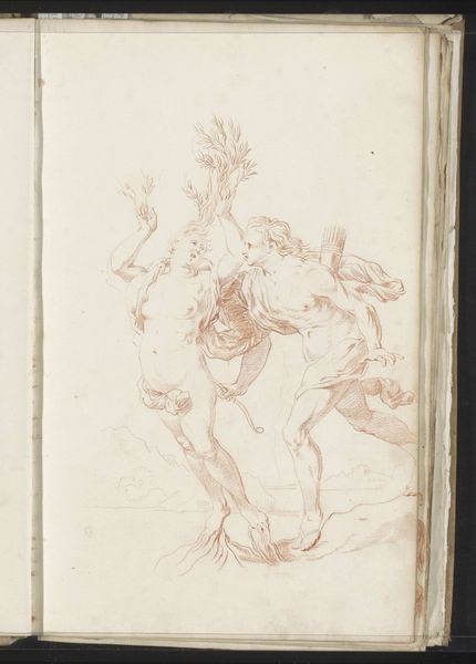 Curator: The fall of Icarus is rendered here, circa 1701, by Jacob Toorenvliet, in ink on paper. A narrative scene conveyed in strokes of delicate precision. What catches your eye? Editor: The overwhelming sense of…space. Or, perhaps, emptiness? The tower and distant shore emphasize Icarus's isolation, mid-fall. Curator: The linear perspective certainly enhances the drama, directing our gaze downwards, mirroring the tragic trajectory. What is the meaning in his face? Editor: It’s an interesting take on the myth, in my view. The drawing isn’t interested in a highly polished, idealized Icarus, nor does it focus on horror or torment. The loose use of line implies instability, emphasizing fragility against a dominant, oppressive sky. Curator: An insightful interpretation, seeing how Toorenvliet worked during the Baroque period. Consider the interplay of light and shadow; see how they delineate the figures, adding depth. Does that help in assessing the emotion conveyed? Editor: It hints at it, certainly. I wonder, though, how much of the emotive potential is being filtered through the lens of, perhaps, upper-class patronage. Does that status shape its message? The lack of extreme agony could stem from artistic restraint to conform to social sensibilities of the era, rather than raw personal expression. Curator: It is always interesting how that may inflect emotion. Editor: True. So in thinking about how cultural and social structures intersect with artistic intentions: does the fact that it's on paper and drawn in ink provide it greater reach? How did images and narratives get circulated at the time, and who had access to them? I wonder about the original function of the image. Curator: These are valuable considerations in comprehending the broader cultural context of this historical composition. By examining the relationship between aesthetics, technique and dissemination we uncover potential pathways of influence in Dutch society at the turn of the 18th century. Editor: Precisely, it offers a glimpse not just into art-making, but the broader socio-cultural milieu. Curator: Reflecting upon this small yet powerful scene, we recognize that there can be tragedy and power in simplicity. Editor: Yes. Despite the sparse elements of a landscape on paper, we have together located how historical interpretation shapes a work like Toorenvliet's “The Fall of Icarus”.