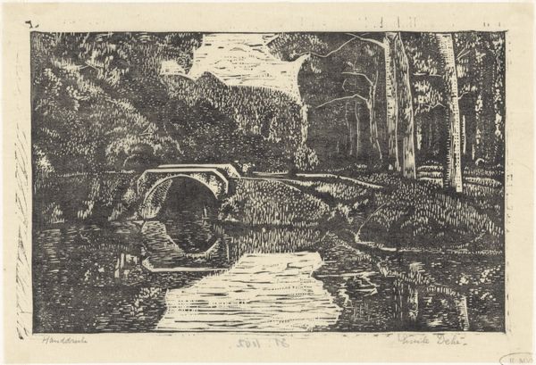 Curator: So, here we have "Bridge over a Moat in a Forest" by Emilius Wilhelmus Dehé, dating roughly between 1896 and 1947. It's a woodcut, currently residing here at the Rijksmuseum. Editor: Immediately, I'm struck by the contrast, that stark black and white. It creates a surprisingly soft, almost meditative mood despite the hard lines of the woodcut. Curator: Yes, that starkness emphasizes the geometry, doesn't it? The bridge, particularly, becomes this defined, almost stoic shape amid the lush, unruly forest. Do you think there is tension here between industrial intrusion and the wildness of nature? Editor: Absolutely. This composition speaks to the human imposition on natural spaces, yet also a harmonious blending. Look how the reflection softens the bridge's harsh angles and mirrors its surroundings! There's a constant play here with the water, like this act of bridging can happen without violence. What about the forest? What's your feel about this density? Curator: You know, there's something almost claustrophobic about it. That darkness encroaching… maybe that's a projection, a feeling I'm bringing, but the bridge feels like a fleeting moment of open clarity before being swallowed by the woods. It seems like Dehé is talking about the need for quiet self-reflection and finding those rare moments of freedom in our increasingly suffocating times. Editor: That sense of suffocation reminds me of the rapid industrial expansion of that era and anxieties around what technology does to community, belonging and one’s connection to the earth. This artwork is then less about geometry and more about access. The woodcut style reinforces a return to “basics.” It invites questions: who had the time to traverse nature, what are the politics of leisure? It creates so many rich layers. Curator: Precisely. It's that dance between light and shadow, stillness and movement, control and abandon… a conversation that really resonates even today, in such a different, more fast-paced age. Thank you, thank you, that helps deepen my experience of this art piece. Editor: My pleasure. May this art piece inspire others to pause and see the quiet power and social weight in all our engagements with nature.