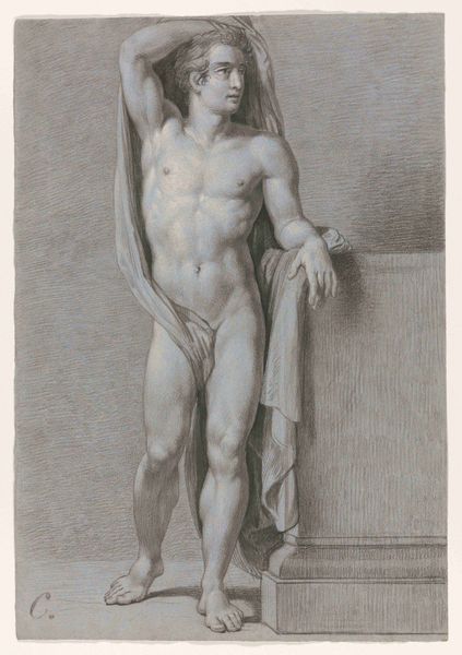 Editor: Here we have Giovanni Jacopo Caraglio’s engraving, “Bacchus standing in a niche…” from 1526. It's currently held at the Metropolitan Museum of Art. My first thought is that Bacchus looks surprisingly serious. I’m used to seeing him portrayed with a sense of joviality. How do you interpret this work? Curator: Indeed. Though this rendering of Bacchus doesn’t exude his signature ecstatic frenzy, it resonates powerfully with his association with cyclical renewal. Consider how the grapes he holds are both fruit and a symbol of fermentation, a transformation, carrying a host of implications surrounding the human experience. Note the satyr, both man and animal. What stories of cultural memory and psychological depths does this pairing evoke for you? Editor: The duality of transformation and nature... it is also very Roman. Given it's from the Italian Renaissance, how much would the original viewers have understood or cared about those classical roots and symbolisms? Curator: Immensely! The Renaissance was, in essence, a rediscovery of those roots. Each vine, each leaf, whispers echoes of ancient rituals, of altered states and communion with nature. Think about the tradition of the Roman Bacchanalia, or Dionysian festivals, which are celebrations of liberation and abundance. In this, there's not a feeling of hedonism, but a sense of divine power. The artist evokes the symbolic language of antiquity for a knowing contemporary audience. Editor: That’s really interesting. So even though the depiction seems stoic, the context gives it a layered, almost hidden depth. It highlights not just classical knowledge, but its enduring influence, as the vines connect through generations! Curator: Exactly. Each viewing across time adds new layers. It seems, Bacchus continues his eternal harvest through the very act of interpretation!