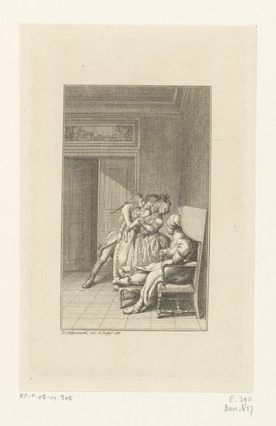 This is Carel Frederik Bendorp's etching, "Interior with an old sick woman and her family." It presents a scene of domestic life, one tinged with the melancholy of illness and mortality. During the 19th century, the Netherlands was undergoing significant social and economic changes, and Bendorp, who came from a military family, focused on everyday life. Here, he explores themes of family, caregiving, and the quiet dramas that unfold within the home. The young couple's embrace, filled with both affection and a sense of responsibility, is the focal point. While the old woman fades in the background, her illness is a palpable presence. A somber mood permeates the scene, softened only by the tender interactions between the figures. The dog seems to mirror this emotional atmosphere. Bendorp invites us to reflect on the universal experiences of love, loss, and the cycle of life. The print captures the delicate balance between personal emotions and the broader societal context of family and duty.