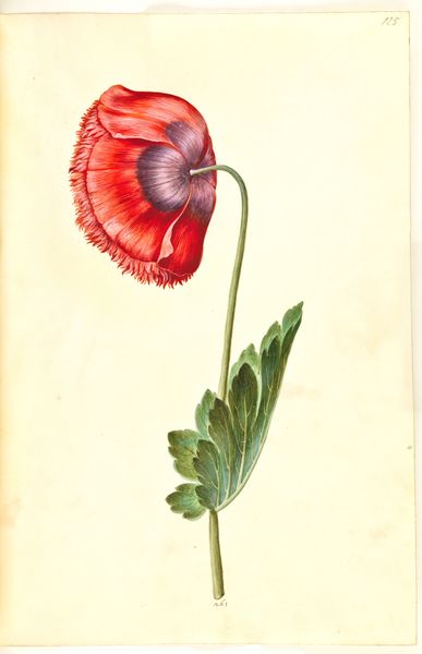 Hans Simon Holtzbecker created this botanical study of "Papaver somniferum" with watercolour and gouache. The two opium poppies command our attention with their meticulous detail and vibrant colours. The poppy on the left, rendered in hues of red and hints of purple, displays an open face, while the right poppy, with its deeper shades, has a more closed and mysterious presence. Holtzbecker's work transcends mere botanical illustration; it subtly engages with semiotic codes. The flowers, commonly associated with sleep and dreams, are presented with scientific precision but also with an aesthetic sensibility. The artist doesn't just depict; he interprets, prompting viewers to consider the cultural significance of the poppy, historically linked to both healing and oblivion. Note the artist’s meticulous technique, evident in the delicate rendering of each petal and leaf, demonstrating both artistic skill and an intent to categorize and understand the natural world through visual means. This dual function underscores a broader cultural preoccupation with knowledge and representation during Holtzbecker’s time.