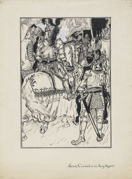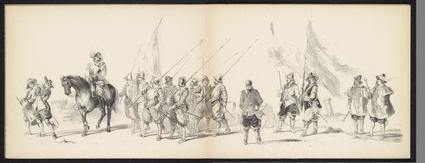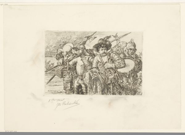 Curator: Well, isn't this evocative! I am instantly reminded of childhood toy soldiers. There’s a quirky charm, an almost playful quality despite the serious subject matter. Editor: The "Grenadiers van de Keizerlijke Garde met trommelaars," or Grenadiers of the Imperial Guard with Drummers, made with pencil, pen, and ink by Willem Constantijn Staring in the late 19th or early 20th century gives us a window into genre-painting and military representation. Curator: Oh, the clash! This drawing really confronts how we engage with displays of power. Think about it: the grand uniforms, the rigid formation. And yet, captured in delicate lines, they are almost rendered harmless. How fascinating. Editor: It's intriguing to consider the context. Staring was working in a period of significant social upheaval across Europe. The rise of nationalism and industrialization heavily impacted views of both the military and representation. This could be interpreted as a reflection on the pomp and circumstance of military power versus the human cost of conflict. Curator: Exactly! And let’s consider the almost obsessive detail in the Grenadiers' headwear versus the rather simplified rendering of their bodies. Are we meant to focus on the trappings of power and status? I sense a subtle critique of superficial displays of strength. Editor: Absolutely. Furthermore, the academic art and realism shown may well challenge viewers to contemplate their relationship with authority and order. The composition implies a narrative about discipline and spectacle but I feel the human figures give these characters the real value of storytelling in social observation. Curator: It is precisely this tension between realism and the suggestion of satire that makes the piece so compelling. It invites us to question not only the representation of military might but the values that underpin it. The power is there. But what does the artist think? It certainly holds water. Editor: Yes, what seemed straightforward on the surface proves to have a nuanced and complex dialogue about its place in visual culture. The echoes of history are quite present but also their impact to contemporary theory today is clear. Curator: Definitely one to stay with me for a while, I love the initial simplicity of it all. The history really helps it find context to what can be at first lost. Editor: Indeed, the artistic decisions spark vital questions regarding society, class, gender, and so on. Art is truly amazing when you can add your own lived experiences and learn from that!