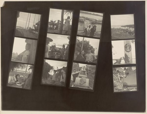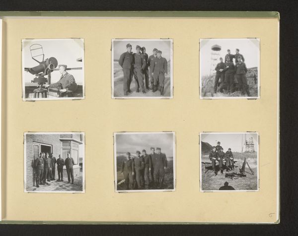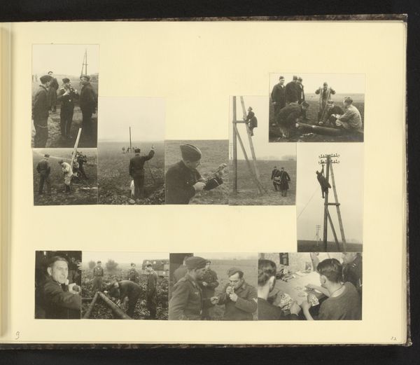 Curator: The piece before us, simply titled "Kabels trekken," or "Pulling Cables" in English, originates from the period of 1942 to 1943. Its authorship remains anonymous, but we do know that this gelatin-silver print offers a fascinating, though unsettling, glimpse into the past. Editor: It has this stark, almost clinical feel to it. Like evidence… Pieces of something bigger, maybe more sinister than we realize at first glance? Curator: Exactly. As a piece of photojournalism presented in a seemingly haphazard collage of imagery, it invites speculation, doesn't it? One sees officials inspecting documents, plumes of smoke, the digging of what I presume are communication trenches. There’s also what looks like detonation equipment, the cables themselves snaking across the terrain. The symbolism, particularly during those years, is hard to ignore. Editor: Let's talk about the medium, this gelatin-silver print, though. It’s really interesting how this process becomes so integral to the creation and preservation of historical narratives. It freezes a specific reality within the social context, particularly when the photographer’s intention seems geared toward objectivity or simply the recording of everyday labor and processes that facilitated that period of conflict. But "anonymous," why the veil of secrecy? Was it that the maker wished to avoid something nefarious being attributed to them? Or perhaps just remove themselves as a presence from such potent circumstances? Curator: The anonymous authorship throws a haunting wrench into interpretation. There's an intentional distancing—perhaps fear, or even the hope for impartiality. What does remain tangible is the record of labor… the physical act of 'pulling cables,' constructing these pathways of information, whatever nefarious schemes that was supposed to fuel. Editor: It makes you think about what goes into wartime logistics beyond the heroic battles depicted in propaganda, you know? How the unacknowledged labor of many fueled the efforts and ultimately becomes entangled with outcomes and consequences they didn't initiate. You begin to notice these materials like dirt, wire, fuel that is consumed and often buried along with people in wartime conflicts that has a cost that keeps being carried and borne, both material and figurative... It adds layers to something one might have missed when judging with an eye simply looking for information. Curator: Indeed. A meditation on process, yes, but also, a spectral whisper from an artist shrouded in mystery, compelled, I imagine, to etch something—no matter how abstract—of that time in memory, if for no other reason than it was something he, or she, felt deeply compelled to produce and to see.