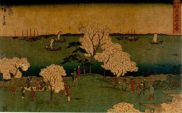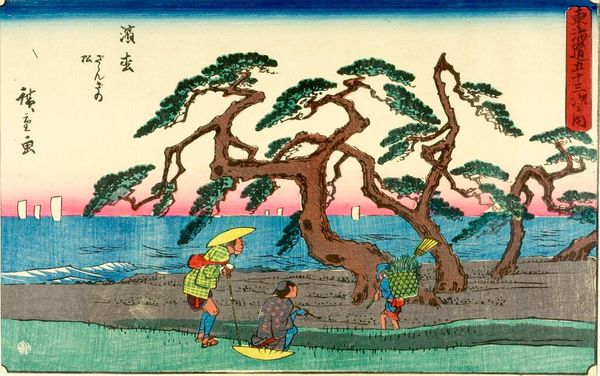 Editor: This is "Landscape" by Utagawa Hiroshige. It's held at the Harvard Art Museums, though we don't have a date listed. It feels like a snapshot of everyday life. What do you see in terms of the production and its cultural value? Curator: I'm immediately drawn to the woodblock printing process. Consider the labor involved in carving those blocks, the specific papers used, the pigments carefully applied, and how these materials contribute to the final product. Also, think about how it speaks to the availability of art to the masses via prints like these. Editor: So, it's less about the scene itself and more about how it was made, and who could access it? Curator: Exactly. It blurs the lines between "high art" and a more accessible, consumable product reflecting labor and materials in 19th century Japan. Has your view changed at all? Editor: Definitely. I hadn't considered the economic and social aspects of its production before. Curator: Understanding the materiality opens up a whole new way of appreciating the piece.