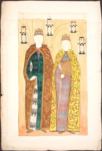 Editor: Here we have Niels Larsen Stevns's "Kopi af mosaik i St. Agnese fuori le Mura, samt notater", made between 1902 and 1905, using watercolor and drawing. The mosaic’s figures stare straight out at me, they're almost confrontational. What strikes you most about this piece? Curator: It's wonderful, isn’t it? Stevns isn’t simply copying; he's channeling. This isn't just lines and colors, it's an echo of Byzantine spirituality filtered through his own sensibility. That golden ground isn’t just decorative, it’s… transcendence made visible. And his line—so spare, so sure. Tell me, do you feel that tension between reverence and reimagining here? Editor: Absolutely! It’s like he’s both honoring the original and making it his own. The notes scribbled across the top - are those colors? Are they insights, like artistic breadcrumbs? Curator: I think so. Stevns is whispering to us, almost daring us to peek over his shoulder and share his private, visual experience. He isn’t just capturing what he sees, he is also recording how the ancient mosaic makes him *feel*. The figures have a raw, human energy about them that Byzantine art often downplays in its quest for idealized perfection, no? I see Stevns trying to grab hold of something powerful - it resonates, and this resonance travels across a thousand years, across media from mosaic to watercolour. Do you feel it too? Editor: Yes, it’s like looking at a conversation between artists across centuries. Thank you, I wouldn't have looked for that otherwise! Curator: My pleasure. It is nice to hear a familiar story from someone who knows that truth changes, as much as beauty always rings true.