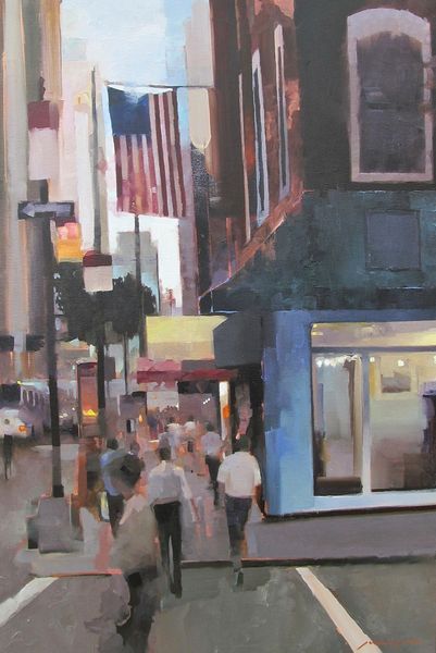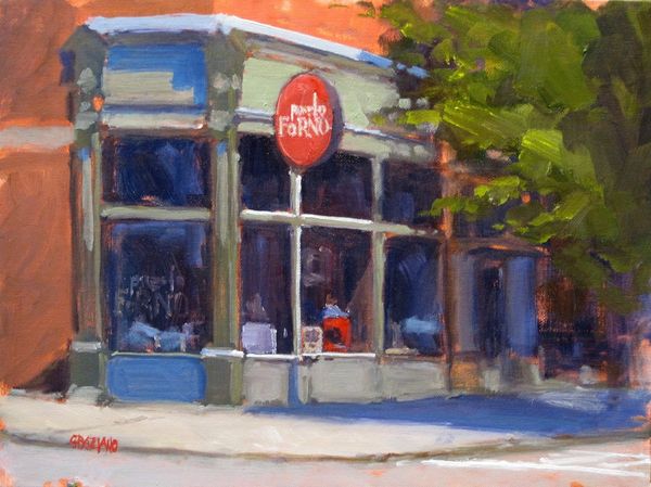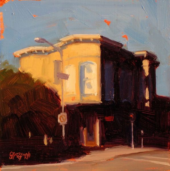Editor: So here we have "Seeing Red" by Dan Graziano, done in oil paint, apparently en plein air. There's a kind of stillness in the scene despite all the city elements... palm trees, traffic lights, even a little restaurant patio. How do you read this, especially with that bold title? Curator: You know, it strikes me as an ode to the mundane. Graziano’s eye seems to fall on those everyday, almost jarring encounters – the red of the traffic light holding up movement, the red of the awning beckoning pause. Think about the way red hits us—alert, urgent. What is he urging us to notice in this snapshot of city life? Is it perhaps about finding vibrancy within the routine? Editor: That's interesting...a kind of vibrant monotony. I initially just saw it as a simple, almost photographic, scene. Curator: Precisely, and consider that "seeing red" isn't just about anger or frustration, right? It can also signify stopping, pausing, reflecting. It might be a visual pun! Do you see how the soft edges and brushstrokes almost melt these ordinary objects together? Editor: Yes, they aren’t sharply defined. It gives it that slightly dreamy, impressionistic feel. The edges sort of blur. Curator: Like a fleeting moment caught on canvas, wouldn’t you agree? Like how a memory blurs over time, so we are just left with the faintest impressions and strongest colours? Editor: Absolutely. I’m starting to see that even in the most commonplace setting, there's an artist’s invitation to slow down and find meaning. I’m guilty of just speeding through the reds of my day. Curator: As are we all, perhaps.