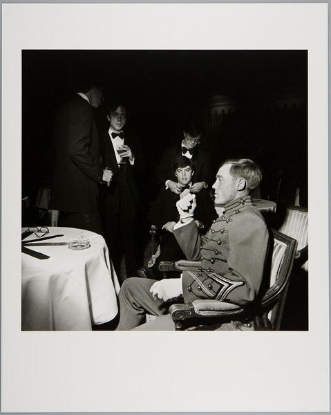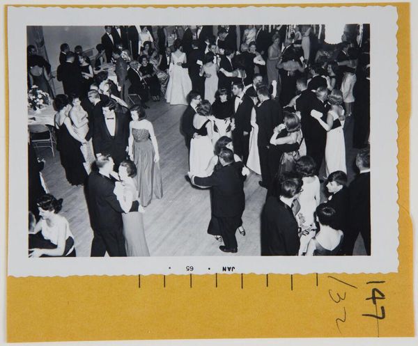 Robert Burian made this silver gelatin print, "Untitled (young men and women at tables at ball)," sometime around December 1962. The photo’s material qualities are essential to its impact. The stark contrast between black and white emphasizes the formal attire of the subjects, highlighting the textures of their tuxedos and dresses. This choice of material evokes a sense of nostalgia, reminiscent of mid-century photojournalism. Consider the labor involved in capturing such an image: setting up the shot, developing the film, and printing the photograph. Each step requires skill and precision. The silver gelatin process itself is steeped in history, a craft refined over decades. By understanding the materials and processes behind this photograph, we gain a deeper appreciation for its significance. It challenges us to see photography not just as a medium for documentation, but as a craft with its own rich history and set of social implications.