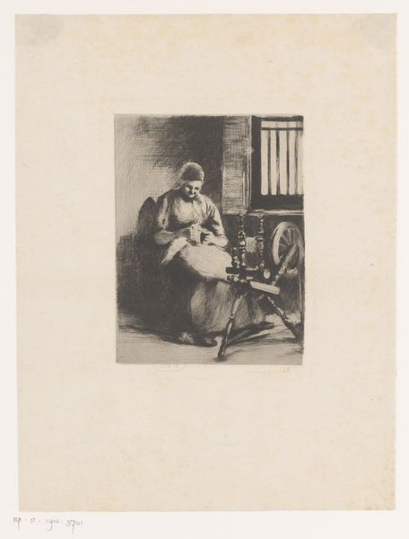 Editor: Here we have "Boereninterieur met vrouw en twee kinderen," an etching on paper by Charles Albert Waltner, created sometime between 1856 and 1925. There's a real sense of melancholy here. What stories do you think it's trying to tell? Curator: The setting immediately speaks to themes of poverty and domestic labor. Look at the mother's weary gaze, the stark interior. How does this image reinforce or challenge existing narratives of women and labor during this period, particularly within the context of industrialization and social change? Editor: So, you're seeing this image as more than just a genre scene, but as a commentary? Curator: Precisely. It prompts us to consider the socio-economic realities faced by many families, especially women. Etchings like this became widely accessible through print, enabling a dialogue on social issues for a broader audience. Does this challenge your initial sense of melancholia by possibly opening avenues for change through dialogue? Editor: I see your point! The medium itself allows this image to spread and potentially create a wider conversation. Curator: It also seems relevant to acknowledge that images like these can perpetuate stereotypes about the working class. How do we approach art like this critically, acknowledging the artist's perspective while being mindful of the potential for misrepresentation? Editor: It's a fine line, right? The artist might be trying to evoke empathy, but it could also unintentionally reinforce harmful biases. Curator: Exactly. Understanding the social and political climate during Waltner's time is vital for a comprehensive reading of the work, no? Editor: It definitely reframes the artwork in a powerful and thought-provoking light. Thanks! Curator: My pleasure. Considering those broader narratives allows for a much more nuanced conversation about the artwork's enduring relevance today, no?