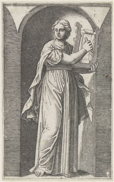 Editor: Here we have "Young Woman with a Lyre Standing in a Niche," an engraving by Marcantonio Raimondi, created sometime between 1511 and 1520. The figure is strikingly classical and yet reserved. I find it curious how contained she appears within the niche, cradling that lyre. What do you make of the framing? Curator: Isn't it interesting? This niche almost feels less like a grand architectural statement and more like... well, a very elegant cage. The figure’s relationship to music is so fascinating here! It is as if she and her lyre are meant to represent Harmony. What are your thoughts on the relationship of the figure and space? Editor: I see what you mean by “elegant cage.” It is interesting to consider that the very thing that should elevate the woman – her talent – confines her in a way. Her shoulders also seems unnaturally broad. Curator: The printing has almost flattened and squared her! Her garment is another striking component of this work; you almost want to touch and test the silk. Notice, however, that this volume of fabric obscures parts of the musical instrument itself. Does it soften her stance, do you think? Does it soften music itself? Editor: The garment does soften the overall form, offering a sense of humility perhaps. But thinking of how carefully she holds the lyre makes me question that a little... There is this sense of protectiveness, as if her artistry is extremely personal and even secretive. It almost demands reverence and respect. Curator: And isn't that such a delicious paradox! A "cage" of her own making... a silk garment which obscures... The beauty, here, resides not just in what Raimondi chose to show us but how the negative space and subtle textural rendering speak just as loudly. And that for me makes this a truly lasting, if enigmatic, composition.