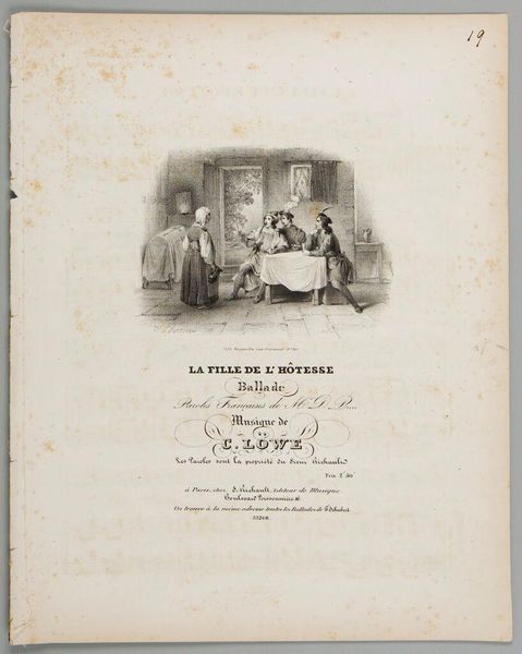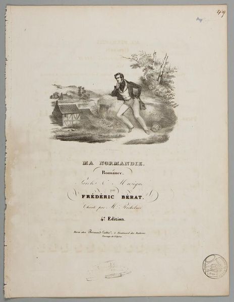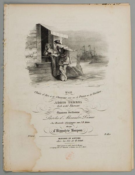 Editor: Here we have Sheet Music: The True Artist Painter, an anonymous work. The cover illustration depicts a painter in his studio with a patron. What symbols or visual cues stand out to you? Curator: The sheet music cover offers a satirical glimpse into the art world. Notice how the artist's grand gesture contrasts with the apparent simplicity of the canvas. The woman seems unimpressed, almost suspicious. Consider how this image challenges our assumptions about artistic genius and patronage. What feelings does the image evoke for you? Editor: It does feel a bit mocking, like it's questioning the sincerity of the artist. I see humor and social commentary here. Thanks for pointing out those details! Curator: Exactly! Visual symbols often layer meaning upon meaning, reflecting a society's values and anxieties.