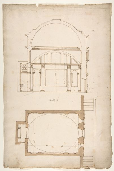 Curator: Editor: So, this is an architectural study: "San Lorenzo, New Sacristy, niche frame, tabernacle, plan and elevation" dated between 1500 and 1560. It's anonymous, and rendered in ink, I think? It seems… practical. It's a design, of course. What's striking is seeing the making itself so plainly on display. What can we learn from looking at the construction of this design? Curator: Well, looking at the process, we immediately confront the material conditions of artistic production. This isn't some abstract idea; it's ink on paper, lines carefully drawn. Look at the aged paper and the kind of printing style: homemade paper, old engraving style, tea stained, etc.. Ask yourself: How did the availability of materials shape architectural thinking at the time? Was the accessibility limited for all people? Editor: You mean, because it's not like you could just pop down to the art supply store back then? The paper itself, the ink formulation, even the instruments used to draft this – all impacted the design choices? Curator: Exactly. The grain of the paper, the consistency of the ink – those things become integral to the artistic process. And beyond the materials, think about the social context. Who was commissioning this work? What kind of labor was involved in its creation, not just the artist’s hand but the production of the paper, the ink, and all the processes to give visibility to the work? How do these elements elevate and diminish its status from high art to functional drawing? Editor: So, instead of just admiring the finished product, we should consider everything that went into making it possible? Thinking about the materiality gives an awareness that changes how you look at art as it highlights its context. Curator: Precisely. It reveals the tangible and social realities embedded within art making. Editor: That's given me a completely new perspective. Thank you for shedding some light on the importance of material analysis, curator! Curator: My pleasure, every object has an underlying construction, understanding what they mean reveals what they are worth!