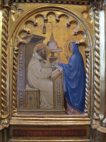 Curator: Looking at "The Coronation of the Virgin with Five Music-Making Angels" by Mariotto di Nardo from 1408… it's in tempera. Editor: It’s quite striking! The figures feel so serene, almost otherworldly, but there's such groundedness with those earthly angels. I'm curious, what draws your eye when you look at this piece? Curator: The materiality immediately speaks to me. Think about the production of tempera paint in 1408 Florence. Each pigment was carefully sourced and ground, often by workshop apprentices. The gold leaf isn't just decorative; it represents a huge amount of skilled labour. What was the role of gilding in Florence at that time, for example? Editor: Hmm, gilding as labor. It emphasizes that even religious icons were made with very material hands? Curator: Precisely. And notice how the punchwork on the gold adds another layer of texture. This wasn’t just slapping gold onto the surface. It was about a specific method that signifies time and control by skilled labourers, and creates an intended impact reflecting status and power. This brings into question, is art defined in these contexts only as fine art, or craft too? How might social class have defined its purpose? Editor: So the materials themselves, even the techniques, tell a story about the society that produced the artwork. What would it have meant to its patron? Curator: I'd hazard to say that the patron valued this visible display of wealth and the skillful handwork because this signified an engagement in religious practice and moral conduct. But, it also showed something of great prestige was possible, even something divine, that would lead the family into favour within that community. Editor: It completely reframes how I think about paintings from this period. It's not just a beautiful image but a physical record of material value and production processes that highlight wealth and community engagement. I never thought of art from this angle before! Curator: Absolutely. By analyzing its material origins, the economic exchanges behind it, and what this communicated about a commissioner's status, we challenge preconceived notions and create new avenues for understanding artworks, that include process, consumption, labor and even exploitation.