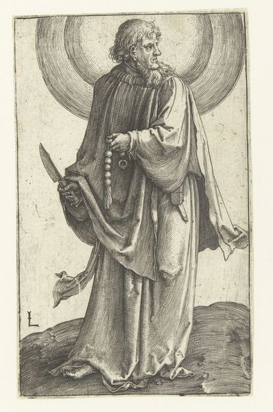 Editor: This is a baroque engraving from between 1623 and 1660 by Pieter de Bailliu, titled "Saint Ambrose as Bishop with a Beehive," currently held at the Rijksmuseum. It depicts a rather stern-looking bishop next to… a beehive? How do you interpret this work? Curator: For me, the engraving itself speaks volumes. The labor involved in creating these fine lines, the tools, and the printing process—it highlights a deliberate choice to disseminate this image widely. This wasn't about unique, precious art; it was about reproduction and accessibility to the masses. Consider, too, the patronage system: who commissioned this print and why? Was it for propaganda, religious education, or personal devotion? Editor: So the beehive... is that purely symbolic, or is there a material connection? Curator: It’s likely both. Bees were a common symbol, representing diligence and eloquence. But I’d push us to consider: where would de Bailliu encounter beehives? The paper he printed on may have used beeswax! And in churches, beeswax candles were essential. This piece points to a network of material relations—the raw materials, the labor of beekeeping and candlemaking, that underpinned the religious and economic landscape of the time. What stories do you think those material processes tell us about the people consuming these images? Editor: That’s fascinating! I hadn’t thought about the beeswax candles. The connection to labor suddenly makes the image so much more grounded. Curator: Precisely. By focusing on materiality, we unveil a much richer historical narrative embedded in even a seemingly straightforward religious portrait. It’s less about veneration and more about understanding the web of social and economic forces that shape both the creation and consumption of art. Editor: I see what you mean. Thanks, I definitely have a lot to think about. Curator: And hopefully look at art in a different light from now on.