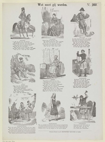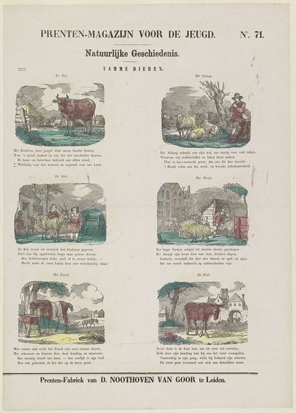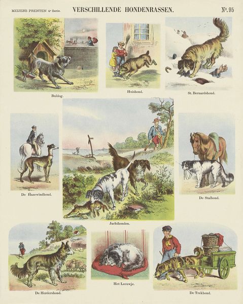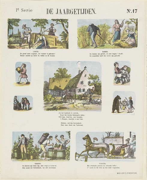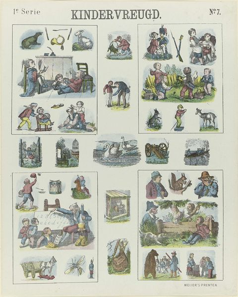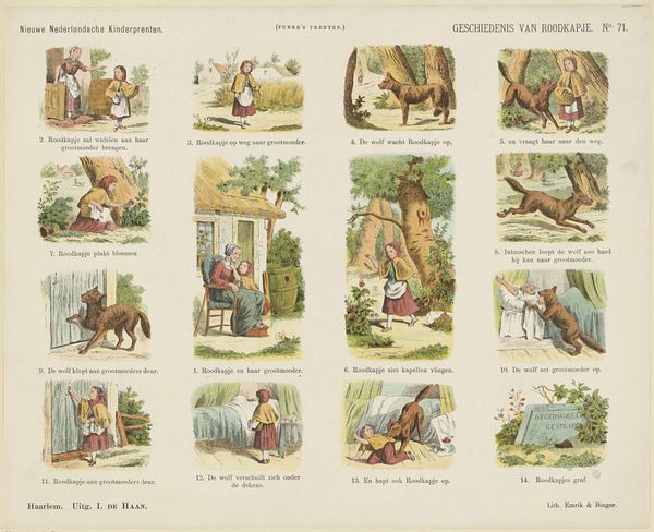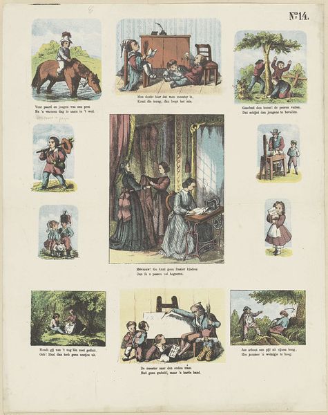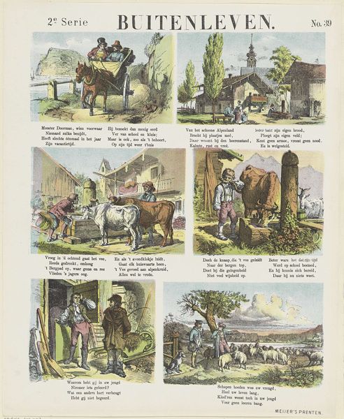 Curator: Here we have "Reisontmoetingen," which translates to "Travel Encounters." It's a lithograph print dating back to 1881 by De Ruyter & Meijer. Immediately noticeable is the way the print is split into multiple vignettes or scenes. Editor: It's like a scrapbook page. Very orderly, yet each scene feels alive with mini-narratives. There's an inherent story-telling here; you want to figure out what happens before and after each image. I wonder what this romantic feeling reminds me of... perhaps when one dreams? Curator: The use of lithography allowed for mass production, and artworks like this would have circulated widely, contributing to a shared visual culture. Romanticism comes into play here; you see in these scenes little glimpses into everyday lives elevated with sentiment and emotion. Notice the different ways travel appears -- stagecoaches and railways. Editor: It's charming, isn't it? How they've captured little snippets, near misses with trains and cozy rooms atop thatched roofs. The colours, they are soft and slightly muted; the hand-written font is delightful! What stands out is its organization and framing, like memories set in visual rhyme, and with this nostalgic haze over what travelling might be like. Curator: Absolutely. Travel, even in these vignettes, isn't merely physical movement; it’s also encountering new perspectives and societal dynamics. How travel influenced or affected these lives or communities -- in that period. We need more scholarship looking into De Ruyter & Meijer as popular image-makers; these mass-produced lithographs played a key role in shaping cultural understanding and romantic ideals for people. Editor: Seeing them compiled this way does make one reflect on the fleeting nature of travel. Brief, intense experiences, little scenes captured in our minds eye that stick around far longer than you expect. Almost like dreams that seem more real and are felt throughout. Curator: Indeed. Each image speaks volumes about society and culture at that particular time. I will carry that with me when considering the artwork, which speaks to social encounters facilitated or prompted by travels. Editor: And for me, this has served to give me the feeling as though my own perspective -- when it comes to travels and journeys, past and future -- is, hopefully, as charming as the collection of these memories felt. Thank you.