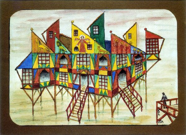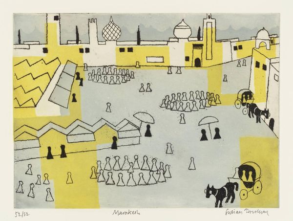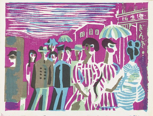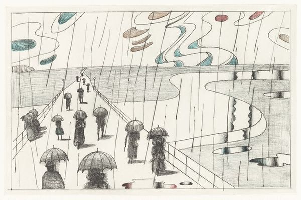 Editor: Here we have "Guys with a Goat," a 1936 ink drawing by Josef Capek. It’s really lively! The red and blue inks make it so vibrant. What initially strikes me is this feeling of… organized chaos. Like a village parade, maybe? What do you see in this piece? Curator: Ah, chaos perfectly describes Capek's genius! Look closer. It *seems* whimsical, doesn't it? Children, flags, a rather distinguished goat, all rendered in a playfully naive style. But remember the year: 1936. Europe was teetering. To me, this isn't simply a joyous parade, but perhaps a bittersweet echo of simpler times, a frantic attempt to hold onto something innocent before the storm. Does that childlike exuberance hide a deeper anxiety, you think? Editor: That's fascinating, I hadn’t considered the historical context. So, the 'chaos' isn’t just stylistic? Are the flags and figures symbolic in any way, possibly reflective of Capek’s concerns about impending doom? Curator: Symbolism is slippery! Those flags could be nationalistic fervor, yes, but consider how Capek flattens perspective. Everyone’s on the same plane, all waving the same flags. Is it celebration, or is it a loss of individuality within a rising tide of something… darker? Even the goat has this unnerving calm amid it all! Editor: It’s unsettling! I see it now – a layer of dread beneath the colourful surface. It completely changes how I perceive it. Curator: Precisely! Capek doesn't hit you over the head. He invites you into this colourful world and then subtly subverts it. Art Nouveau on the brink, perhaps? Editor: Definitely food for thought. I came expecting charming folk art, and I'm leaving with a disquieting commentary on pre-war Europe. Amazing. Curator: Exactly! And that's the enduring magic, isn't it? Art whispering its secrets across time.