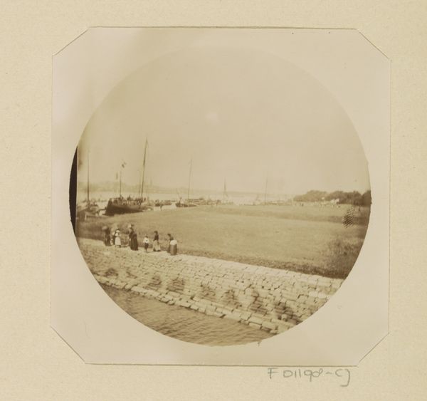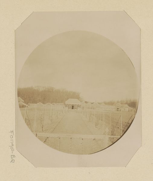 Curator: Here we have Johanna Margaretha Piek's "Gezicht vanuit een geploegde akker nabij Arnhem," a gelatin silver print created sometime between 1889 and 1893. Editor: Immediately, I’m struck by the delicate tonal range, it feels quiet, almost monochromatic. The oval format focuses my gaze. What I perceive is a constructed pictorial space: the dark furrows giving way to what seems to be a structure running through the landscape, bisecting it at nearly the horizontal center line. It feels carefully considered, like a stage set or backdrop, which could well be read as an objective study on the intervention between land and agriculture. Curator: Indeed. The photograph reveals much about the modernization of Dutch agriculture during that period. There's this directness – an almost utilitarian gaze that reveals a particular social interest in landscape at a turning point in the period when ideas around industry, land use, and even social relations, are being intensely questioned, debated, reformed… you have to wonder about her influences from plein-air impressionism as she captured her shots in person, outdoors. Editor: Observe how the placement of the farm building to the left introduces a geometric interplay that feels intentionally structured against the field’s curves. And those furrows—each carefully placed, guiding our eye. It's not merely documentary; it's a composition that subtly elevates the mundane to an almost sublime encounter with the land itself, while holding the entire narrative together. I read that as highly stylized and symbolic in nature. It makes a direct connection with land use and the period's interventionist view of it all, using basic lines, shapes, structures, tonal graduations, textures and balance. Curator: Absolutely. The photographic lens allows Piek to explore the intersection of human activity and the natural world—a testament to the changing cultural perceptions of the rural landscape as the backdrop for the modern experience. Editor: A successful exploration of materiality through a new perspective and methodology of visual composition; it reveals both its formal components and those relevant conceptual, historical layers of analysis, together adding depth and richness for the informed viewer.