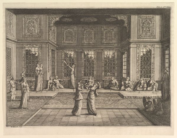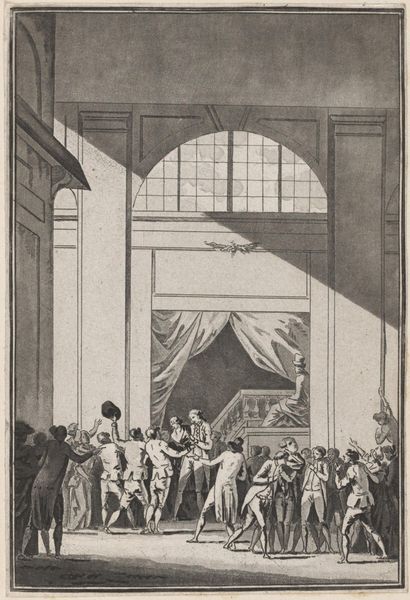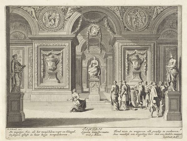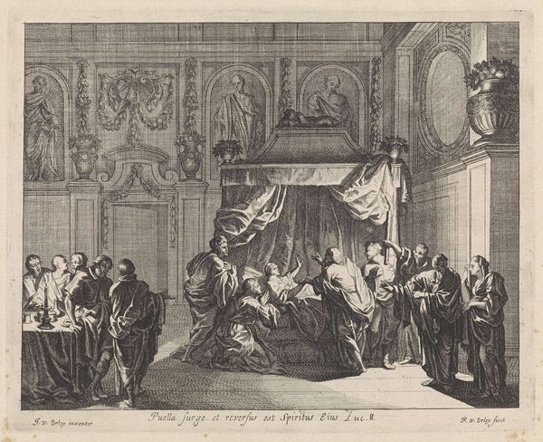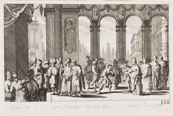 This print, *Christus en de overspelige vrouw* (Christ and the Adulterous Woman), was made by Jan van Orley in the late 17th or early 18th century. It’s an engraving, meaning that the image was incised into a metal plate, which was then inked and pressed onto paper. The process demands careful labor. The artist would have used specialized tools to carve the fine lines that define the scene, building up tone and texture through precise, repetitive actions. This was not simply a reproductive technique, but a highly skilled and valued practice, with its own distinct aesthetic. The stark black and white contrast, and the intricate detail achievable through engraving, give the scene a dramatic intensity. Consider too the social context: prints like these made art and information accessible to a wider audience. It collapses traditional hierarchies separating fine art and craft, high and low culture, and highlights the value of skilled labor in the production of images.