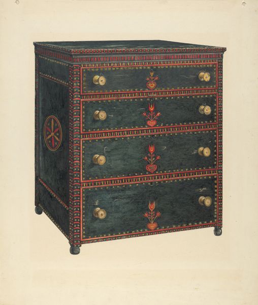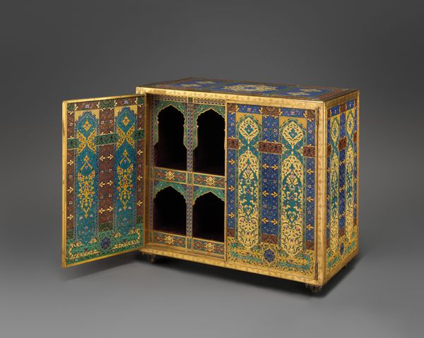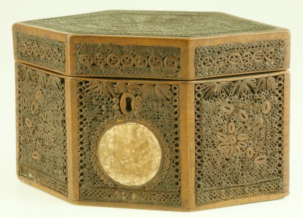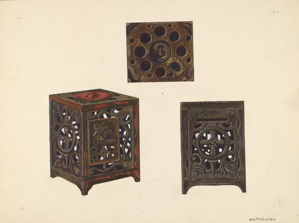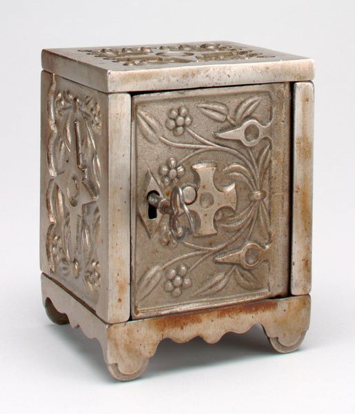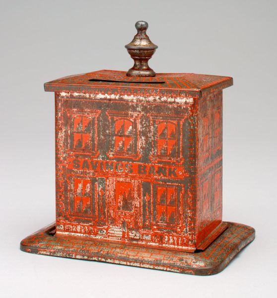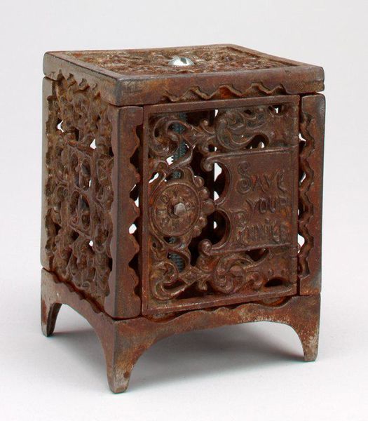 Curator: This diminutive piece, dating from the 1890s, is called "-Church Window- safe still bank" and is attributed to the Shimer Toy Company. It resides here at the Minneapolis Institute of Art. Editor: Its cube-like shape makes it immediately striking; like a miniaturized, somber fortress. The weathered, pitted metal has a tactile appeal despite its obvious rigidity. Curator: Precisely. Observe how the perforations evoke Gothic architecture, echoing church windows in its intricate detailing. Semiotically, the bank appropriates sacred, trustworthy architectural forms to encourage thrift. Editor: Let's not forget it's made of cast metal – an industrialized, reproducible material that enabled widespread access to such novelties. What about the red paint contrasting with the metallic grey, any thoughts there? Curator: The crude paint job does disrupt the solemnity; its imperfection ironically enhances the architectural forms by contrasting. However, you're right, the contrast of materials presents an important tension. Mass production juxtaposed with religious motifs. Editor: Exactly. One can see the marks of its manufacture so clearly; that casting process, likely replicated a thousand times over in some bustling factory. This wasn't crafted by a solitary artisan, this piece represents collective labor and capitalist production. Curator: Indeed. The intersection of industry and cultural symbolism raises thought-provoking questions regarding the period’s aspirations of financial accumulation within evolving class structures. Editor: So we are drawn into considering labour conditions, childhood consumerism, and this complicated cultural dance involving both faith and capital... Curator: Leaving us contemplating not only the craftsmanship, but also the greater context of its production. Editor: This bank functions both as a charming memento and a complex industrial object with far-reaching historical and socio-economic meanings.