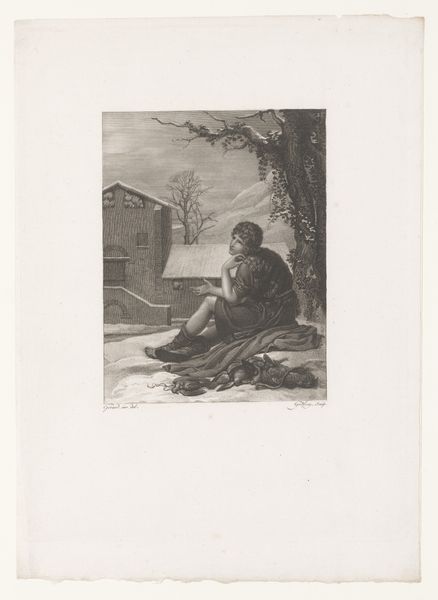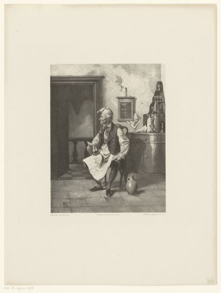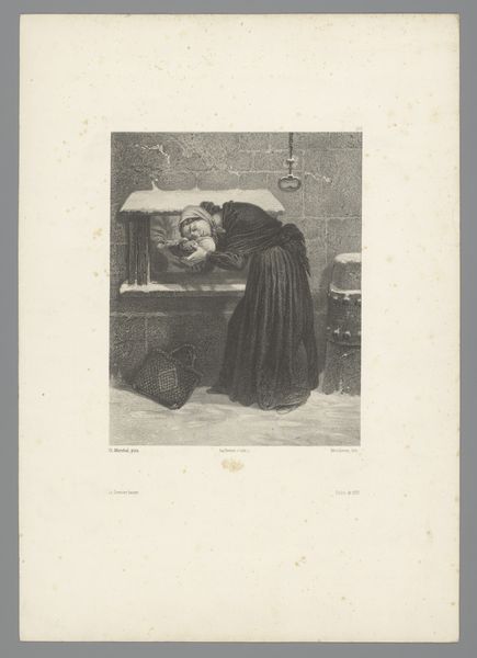 Hendrik Adriaan Christiaan Dekker created this print titled "Vrouw komt uit een kelder" which translates to "Woman coming out of a cellar," at an unknown date. The image captures a woman in what appears to be a moment of emergence or transition. Her attire and the snowy setting suggest a life marked by hardship, yet she holds a bowl, perhaps a symbol of hope or sustenance. It makes you wonder about her story and circumstances in the Netherlands. During Dekker’s time, the 19th-century Netherlands saw significant social changes, including urbanization and industrialization. How did these shifts affect the lives of women, particularly those in vulnerable positions? Dekker’s work offers us a glimpse into the lives of those often unseen, inviting us to consider the power of art to bear witness to their stories. It urges us to reflect on the resilience and agency of women navigating the challenges of their time.