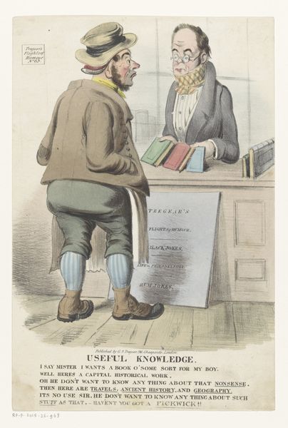 This print, "Schrijver en een Uitgever Bespreken Vertaling", or "Writer and Publisher Discussing Translation," was made by F. Sansom using etching and engraving. This image is dominated by lines, hatched and cross-hatched to create shadow and volume. Note the satirical representation of these two men, the author eager and intense, and the publisher, portly and skeptical. Consider the labor involved in producing this image, from the initial sketch to the meticulous engraving of the plate, and the printing of multiple impressions. The print is an artwork, but also a commodity. The publisher is clearly concerned with the marketability of the book he is publishing. "Nothing will go down but light summer reading" he says. And here we see the intersection of art, commerce, and social commentary. Sansom's print speaks to the changing tastes of the public and the commodification of literature. It’s a reminder that art is always intertwined with the social and economic conditions of its time.