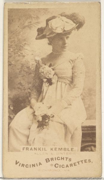 Editor: This is a fascinating portrait of Annie Robe, made sometime between 1886 and 1890 by Goodwin & Company. It combines photography, drawing, and printmaking in an advertisement for Old Judge Cigarettes. She’s so regal-looking. What story do you think it tells? Curator: This image really captures the complex intersections of celebrity, consumption, and gender in the late 19th century. We see Annie Robe, an actress, her image literally being used to sell cigarettes. Editor: So, it's about how women were viewed and used in that era? Curator: Precisely! Think about it: Robe’s likeness, carefully crafted to project elegance and desirability, is essentially a tool to fuel a capitalist engine. Consider, too, who was consuming these cigarettes and how Robe, as a performer, navigated public perception and her own identity. Was she complicit, or was this a strategic move for visibility in a patriarchal society? Editor: It's uncomfortable to consider she may not have had a say. Curator: Exactly. And what does it mean that this image, aimed at attracting male consumers, objectifies her while simultaneously granting her a certain degree of fame? How does this contribute to a narrative that continues even now, with women’s bodies and images used to sell products, their agency often diminished in the process? Editor: So much to consider! I’ll definitely be looking at similar images differently now. Curator: Indeed. This small image opens up larger discussions about power, representation, and the commodification of the female image – a dialogue crucial to understanding both historical and contemporary societal structures.