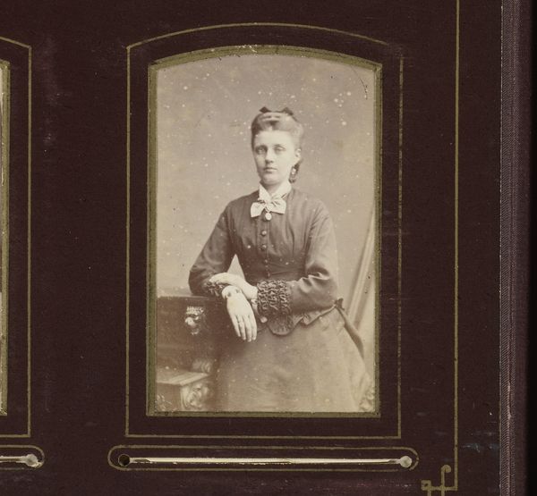 Editor: This is "Portret van een zittende jonge vrouw," or "Portrait of a Seated Young Woman," dating between 1880 and 1901, by Hendrik Boonstoppel, a photograph that’s part of a larger collection, it seems. It feels very formal, yet also intimate, like a glimpse into a specific person's life. What do you see in this piece from a historical point of view? Curator: I see a carefully constructed image intended for public consumption, shaped by the social norms of the late 19th century. Notice the woman’s posture, her dress, even the pearl necklace. These were signifiers of respectability and status. Consider how the burgeoning middle class used photography to project a desired image. Editor: So, it’s about controlling the narrative? Curator: Precisely! Photography allowed individuals to participate in the construction of their public identity. How does this challenge our understanding of portraiture versus genre paintings from the same era? Do you see any differences in approach? Editor: Well, genre paintings were often idealized. This photograph, while posed, seems to capture a sense of…realism, maybe? Curator: Exactly! It hints at reality while still being highly curated. It also democratized the creation and reception of images, influencing visual culture. The fact that the name "Boonstoppel" is visible, may point to the studio that allowed ordinary people to achieve portraiture, rather than exclusively the well-off who could pay for it. These studios had very political role by democratizing the visual medium. Editor: That's fascinating! It's more than just a portrait; it's a document of social change. Thanks. I would have missed that entirely. Curator: And I am certain, thanks to the genre classification of the photograph, it offers an insight in daily life. It gives meaning to "history" as a broader construct.