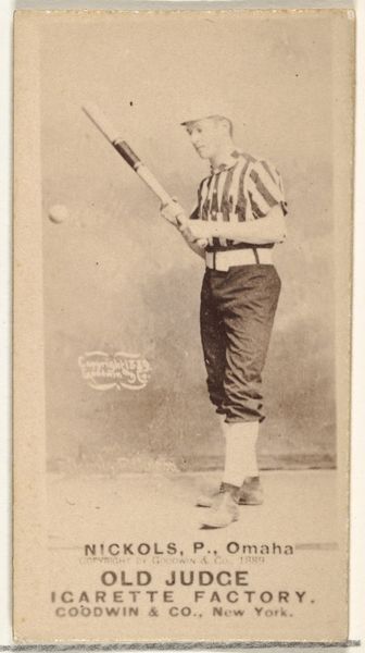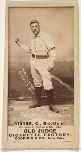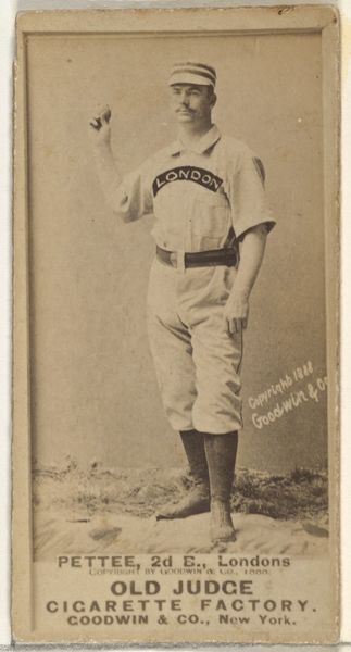 Editor: This is a photo of William T. "Red" Hanrahan, a shortstop for Minneapolis. The image, printed in 1888 by Goodwin & Company for Old Judge Cigarettes, is fascinating! It’s part portrait, part advertisement... What does this photo reveal to you about its cultural context? Curator: It's a baseball card, yes, but consider the role of visual media and emerging celebrity culture. Cigarette cards like this offer a glimpse into the popular obsessions of the late 19th century. Note the brand name: "Old Judge Cigarettes". Images become instruments for promoting a product. What were the intended audiences here? Editor: Baseball fans, clearly, but also...smokers? How does the baseball image connect to cigarettes? Curator: Precisely. The association is aspirational: virility, skill, athleticism. But consider who had access to these images, how they were circulated, and how these commodities played a role in shaping social status. The act of collecting these cards, often at the expense of the working class, demonstrates how cultural value intersects with consumerism and ideas about celebrity. What messages are conveyed about race or social class in baseball photography from this period? Editor: That's a good point! This particular photo, given it was made for an advertisement, presents a romanticized view, probably, with Red Hanrahan representing health and a certain kind of masculinity. Thank you – that really gives me something to think about! Curator: Of course. I’ve found considering visual culture in light of such history enriches my experience.