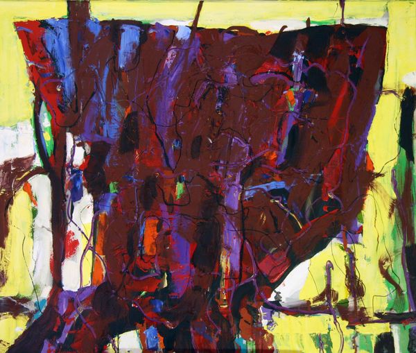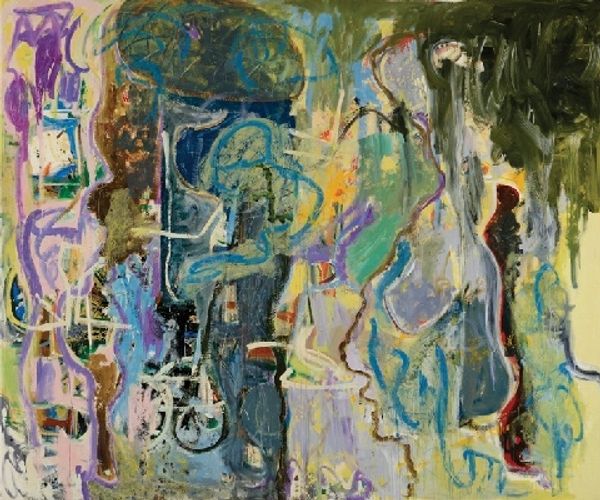 Editor: This is "Autumn" by Gene Davis, from 1955. It's an acrylic painting, and the tones feel very warm, almost rusty. The forms are vague but suggest shapes that are just out of reach of recognition. What do you see in this piece? Curator: I see a dense layering of forms and colours that generate an intriguing tension. The painting foregrounds its own materiality through visible brushstrokes. The composition avoids a central focus, promoting a reading that emphasizes all areas as equally significant. How does this formal distribution influence your interpretation? Editor: I think it keeps my eye moving across the surface, so I'm never quite settled in one place. It makes the piece feel very dynamic, despite the muted palette. Does the palette impact the composition, and do you think Davis makes deliberate choices to maintain this dynamism? Curator: Absolutely. The limited palette creates unity, while the varying tones within each hue give a subtle vibrancy, activating the surface. Consider how Davis avoids clear figure-ground relationships. This ambiguity encourages the viewer to engage with the painting's intrinsic properties – its color relationships and compositional balance – rather than searching for representational meaning. Editor: That makes sense. I was initially trying to find identifiable objects, but the painting resists that. Instead, the formal qualities become the subject itself. I had not initially grasped this effect. Curator: Precisely. Davis is interested in pushing beyond traditional representational painting and highlighting pure form. "Autumn" offers us a compelling exploration of abstract expressionism. Editor: I see it now. It's less about 'autumn' and more about the raw energy of abstract shapes and colours coming together, and creating its own autonomous existence, so to speak! Curator: An excellent assessment!