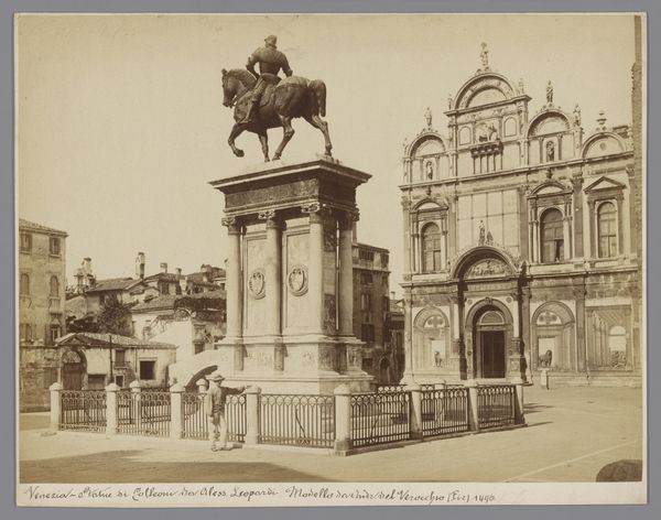 This photograph by Carlo Naya captures the equestrian statue of Bartolomeo Colleoni in Venice. The sepia tones lend the scene a classical, almost dreamlike quality, softening the imposing architecture and sculpture. The composition here is rigorously structured. Naya uses the monument's strong vertical lines to anchor the image, while the surrounding buildings provide depth and context. The statue itself, frozen in mid-gallop, contrasts with the static geometry of the square. This interplay suggests a tension between movement and stasis, typical of Venetian civic life. The formal qualities of the photograph, with its attention to light and shadow, create a visual dialogue between the monument and its setting. Notice how Naya balances the weight of the statue with the intricate details of the surrounding architecture. In doing so, he invites us to consider the relationship between individual achievement, represented by Colleoni, and the enduring structures of Venetian society. Ultimately, this photograph is not just a record, but a carefully constructed argument about power, history, and representation.