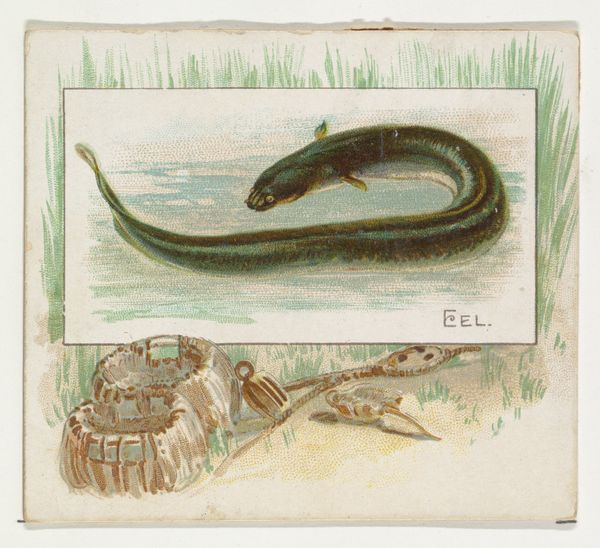 Editor: This is "Lamprey Eel" by Knapp & Company, dating to 1888. It’s a lithograph, a print made for Duke brand cigarettes. It has a muted color palette and delicate lines, very tranquil in tone. I'm curious, what socio-historical contexts do you find most compelling in this image? Curator: The key is to understand this image not just as an isolated aesthetic object, but as a product of its time, deeply embedded in power structures. Cigarette cards like this, which feel almost quaint now, actively participated in shaping cultural values. Editor: Could you elaborate? Curator: Certainly. This image aestheticizes the natural world to promote a commodity—tobacco—drawing from the rising environmentalism and fascination with natural history, while normalizing its consumption. These images circulated widely, shaping perceptions of the natural world within specific social classes, promoting certain scientific narratives over indigenous knowledge. Editor: It's like nature is being packaged and sold along with the cigarettes. Curator: Precisely! Consider who created these images and for whom. Knapp & Company profited greatly, shaping consumer culture and influencing ecological perceptions. It’s an early example of corporate influence intertwined with artistic representation, constructing desires, dictating narratives about nature, and even influencing which ‘facts’ circulated about specific species. Who decides what counts as knowledge and how is it disseminated? That’s the question we should be asking. Editor: That completely changes how I see this seemingly simple image! Thanks! Curator: And thank you for raising the initial questions! By thinking about the historical production and distribution, we are challenging ourselves to read images actively, understanding them as complex carriers of ideology, not just pretty pictures.