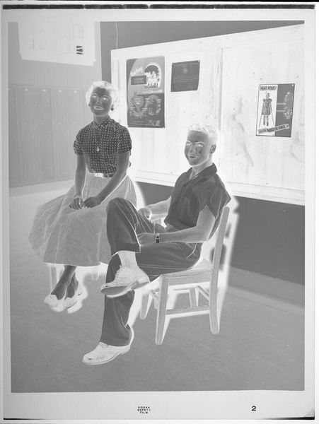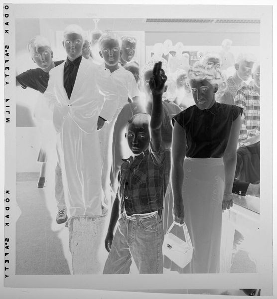 Curator: Here we have Harry Annas’s "Untitled (couple standing in front of chalkboard)", a silver gelatin print residing here at the Harvard Art Museums. Editor: This feels like a high school yearbook photo turned surreal. The stark monochrome, the inverted tones... it's unsettling yet somehow charming. Curator: The chalkboard diagrams a football play, which places the couple within the context of American education and leisure, key societal pillars. Editor: And it speaks to the labor involved in capturing such an image. The silver gelatin process itself, the photographer's role, the subject’s posed stance. Curator: Absolutely. The image hints at postwar gender roles, the man in a casual shirt, the woman in a dress with a matching bag—a constructed image of domesticity. Editor: But there's also a strange flatness to it, almost like a stage set. Are we looking at a genuine moment, or a performance of one? Curator: Good question. It reflects the anxieties of that era, perhaps, as well as its constructed ideals. Editor: It's a potent image that makes you question the materials used in crafting that ideal. Curator: A poignant reminder of photography's power to shape, and reflect, cultural narratives. Editor: Indeed. Makes you reconsider what is captured and what is carefully staged.