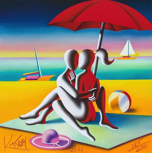 Curator: This is "The Enigma of Desire," painted in 2021 by Mark Kostabi, known for his contemporary pop-art style with elements of surrealism. It's an acrylic painting, fairly modest in scale, wouldn't you say? Editor: The title itself feels like a gentle tease, but that sky! That unapologetic, gradient, radioactive green pulls me in, even before I get to the kissing couple. It’s got a definite theatrical, almost artificial, dreamlike quality. Curator: Absolutely, it exemplifies how Kostabi's work frequently uses dreamlike environments. Note how the figures are largely devoid of distinct features. They almost become archetypes of a universal yearning, amplified by that bizarre city background. It recalls de Chirico, somehow. Editor: Yes! Those mannequin-like figures amplify the sense of distance, or anonymity perhaps, despite the palpable embrace. Are they in love, or are they stand-ins for… well, everyone? The colors certainly clash in a compelling way – that intense blue structure… a backdrop, a fortress, maybe even a cage for desire? Curator: You are right about Kostabi wanting to portray anonymity through his human figures. He sought to eliminate personal expression. This detachment, along with his factory production methods involving multiple assistants, actually courted critique for a perceived lack of originality. Editor: But perhaps that very act becomes part of the statement, right? Taking art production into almost factory setting—if this resonates for you, let’s just stop there for a moment. Because there is plenty here that deserves longer thought! I have so many questions...are we observing genuine emotional engagement, or is the embrace purely performative? Curator: That’s a key question. He mirrors our culture of constant performance and asks questions about our roles within this reality. Does art really need the hand of an individual “genius”, or can creative work express modern mass media by taking advantage of multiple perspectives? Editor: Indeed, "The Enigma of Desire," a modern love story viewed through a cracked mirror. Love in the era of mass production! So, take some moments with Kostabi and consider what's hidden—and displayed—beneath the vibrant façade.