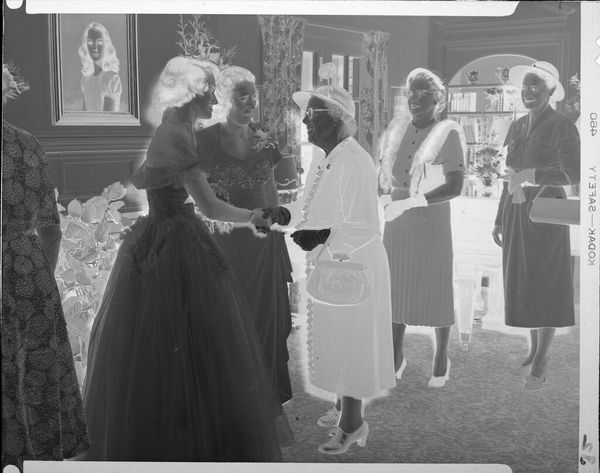 Editor: So, this snapshot by Ken Whitmire Associates shows a bride tossing her bouquet. It's a small black and white print. The inverted tones give it a surreal, almost ghostly feel. What's your take on it? Curator: It’s like a dream fading at the edges, isn't it? This photo captures such a loaded moment with a touch of the uncanny. I wonder, does the inversion speak to the uncertainty, the flip side of expectation, that bubbles beneath all the romance? Editor: That's an interesting perspective. The inverted tones make it hard to connect. Curator: Yes, but maybe that disconnect is the point! We're so used to seeing the 'perfect' wedding, this flips the script and makes us ask, what's really going on here? Editor: I suppose the art lies in revealing and concealing. Thanks for the insight! Curator: My pleasure. It's all about seeing beyond the obvious, right?