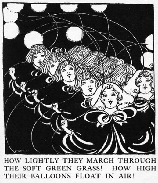Ethel Reed created this illustration for the Arabella and Araminta Stories, and it presents us with a delightful scene imbued with potent symbols of childhood and innocence. At the heart of this image, we find dolls in a garland, emblems of youth and play, rendered with a keen awareness of their symbolic weight. Consider the garland itself; it's an ancient symbol of cyclical continuity, often linked to fertility and celebration. We see this motif echoed through history, from ancient Roman festivals to Renaissance paintings, each time carrying echoes of renewal and joy. These girls are like the nymphs of old. The act of laughter, emphasized by the text, underscores a release of inhibitions, a primal expression of joy. It reminds us of the Dionysian revels, a letting go that taps into a collective well of human experience. Reed's illustration, therefore, does more than depict a simple scene; it resonates with layers of cultural memory.