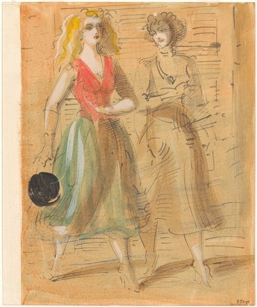Curator: This is Reginald Marsh's drawing, "Two Women," created circa 1940s. It's a work rendered with a sensitive pencil that embodies Marsh's fascination with the everyday lives of urban dwellers. Editor: The sketch possesses a palpable energy. The heavy, dark outlines contrasted with more tentative forms evoke a certain unease and social awkwardness to me. What do you think about the way Marsh composed this portrait? Curator: Marsh was keenly aware of the social realities around him. One can imagine the settings from which these women emerge, maybe a dance or on a city sidewalk, or just walking through public space. What’s compelling is the ambiguity—the suggestion of a shared world, but also perhaps their isolation. It speaks volumes about the public roles of women in mid-20th century urban life. Editor: I’m drawn to their individual symbolic weight, their sartorial cues! On the left, there's this cascade of dark waves juxtaposed against the softer curls and what appears to be a strand of pearls of the other, with her lighter outline. They feel like visual shorthands for different personalities, different stations. Curator: Absolutely, there's that suggestion. And in this period, ideas around femininity and class were being challenged and renegotiated constantly. This drawing seems to capture some of that cultural flux. Marsh clearly had the experience that afforded him a knowing gaze, but it’s up to us to assess the biases and cultural limitations of that gaze. Editor: Well, the fact that we can delve into such nuances in a seemingly casual drawing is the point, isn't it? Images resonate, consciously or not. In this particular drawing, they remind us about our human narratives around the time, even decades and centuries later. Curator: Agreed. Marsh provides us a window not only into his time, but also how images themselves participate in constructing collective meaning and historical memory.