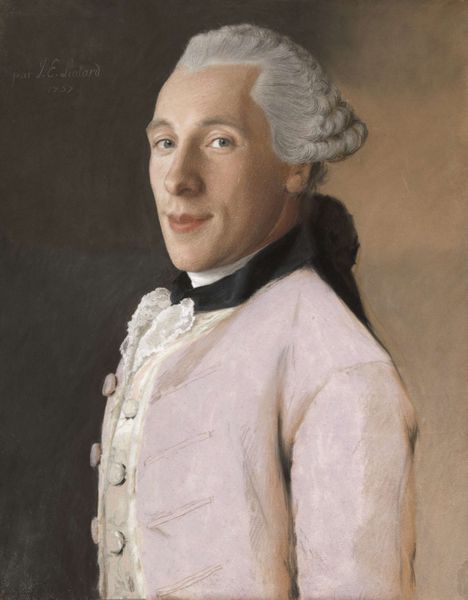 Curator: This is Joseph Duplessis's "Autoportrait," created in 1780. It’s an oil painting, and a rather engaging one at that. Editor: My first thought? It's very…pink. The man's coat, his cheeks—it all has this gentle, rosy hue. Almost makes you think of sugared almonds or something. Curator: The color certainly does establish a mood. It speaks to the Rococo style, a period that reveled in ornamentation, playfulness, and lighter palettes. These symbols are also visual signifiers of status and taste in late 18th-century French society. Editor: Taste, definitely. But it also strikes me as slightly melancholic. Look at his eyes; there's a knowingness there that isn't quite joyful. The overall effect reminds me of certain moments, like you see it from behind a slightly rose-tinted and slightly blurring film. Curator: Yes, the coloring lends it a romantic sheen, almost masking its true reality. Self-portraits can act as carefully constructed displays of the self, presenting a carefully curated image to posterity. His subtle smile does seem more practiced than sincere, you are right. Editor: I think it's more than just self-representation. He's literally facing himself in the mirror as he's painting, a very common motive. I mean, it has to be odd, right, looking at yourself so intensely and trying to reproduce it on a canvas. A deep kind of meditation, if I allow myself a speculation. Curator: An apt description, considering his awareness of visual symbols and how these create collective memories, or as art historian Svetlana Alpers might suggest, creates cultural visual maps. Duplessis wasn't just capturing a likeness but consciously contributing to his artistic legacy. Editor: Legacy indeed. Next time I look at myself in a mirror, I'll think of him, surrounded by all that rose. There is some truth in that surface if you know how to gaze, you know. It is nice, really. Curator: Agreed, I feel now the work tells us perhaps even more about our world, today.