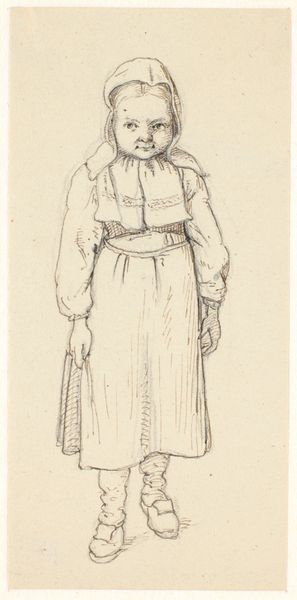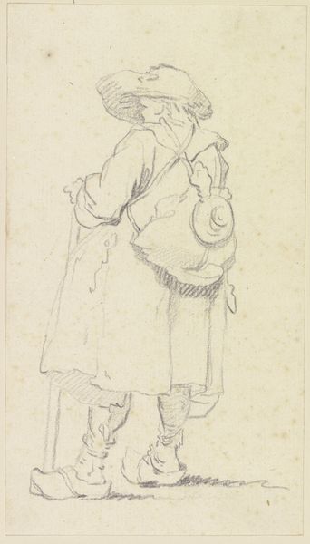 Editor: Here we have Nicolai Abildgaard's "A Woman with a Basket in One Hand and a Bundle of Spoons in the Other," dating from 1743 to 1809. It's a pencil drawing, quite simple in its presentation. What do you see in this piece, focusing perhaps on its formal qualities? Curator: Immediately striking is the stark linearity, a kind of austere elegance in the figure's rendering. Note the meticulous, almost architectural quality in the pleats of her skirt, contrasted with the looser, more organic lines defining her headscarf. There's a clear demarcation between these zones. What function do you think these stylistic differences serve in creating a complete representation? Editor: Maybe it is just trying to show differences in materials by varying the linework. So what would you say is the artist's main interest here: realism? Composition? Curator: "Realism" is a term that bears close scrutiny. Here, realism appears tempered. Consider the slight distortion in proportion—the hands perhaps a touch too large, the feet somewhat simplified. Does this not detract from pure mimesis and foreground instead a particular kind of stylized rendering? We may then inquire how this treatment emphasizes, distorts, or complicates our reading of her status, or role, or meaning. Editor: I suppose it’s about something other than just trying to capture what’s literally there in front of him. Thanks. I had not thought of it in those terms. Curator: Indeed, that’s the challenge of engaging deeply with artworks like these – moving beyond mere representation to understand the formal devices at play in shaping meaning.