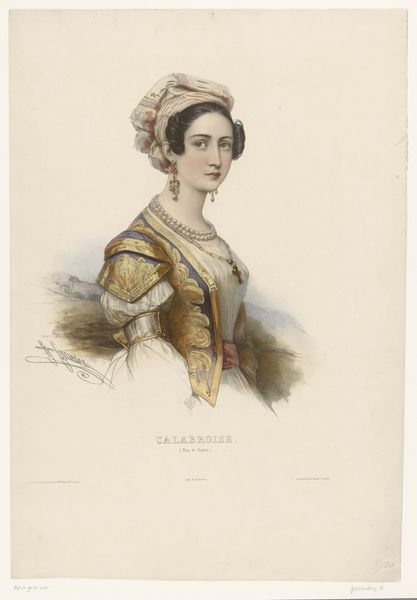 Editor: Here we have Henri Grevedon’s “Vrouw in Spaanse dracht,” or “Woman in Spanish Dress,” created sometime after 1839. It’s a watercolor painting that strikes me as a fairly straightforward portrait, though the textures in her veil are interesting. What stands out to you about this piece? Curator: I'm drawn to consider the context of its creation. It’s watercolor, a relatively accessible medium at the time. How does the ease of production and dissemination through prints influence its reception and the message it conveys? It is, in essence, mass culture. Editor: That’s a great point. The ease of reproduction makes it available to a broader audience, changing the traditional dynamic between artist and patron, right? What about her attire; does that tie in? Curator: Absolutely. The ‘Spanish Dress’ becomes a signifier, perhaps of romanticism's fascination with other cultures, or even colonial power structures. Was it just a pretty costume, or a commentary on global trade and the availability of exotic materials? What kind of work might go into constructing such a garment? Who profited from its design, labor, and circulation? Editor: I hadn’t thought about that, the connection to production and who profits from the textile trade. It feels less like just a portrait now and more like a question about global economies. Curator: Exactly! Examining art through a materialist lens forces us to look beyond surface appearances and see the complex networks of labor, materials, and power that are embedded within seemingly simple objects. Editor: I’ll definitely look at art differently now, focusing on what it is made of and who was involved in its making.