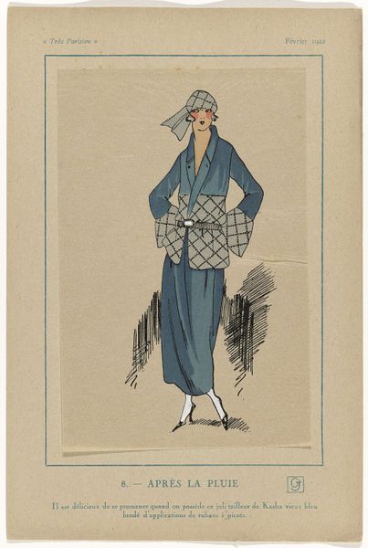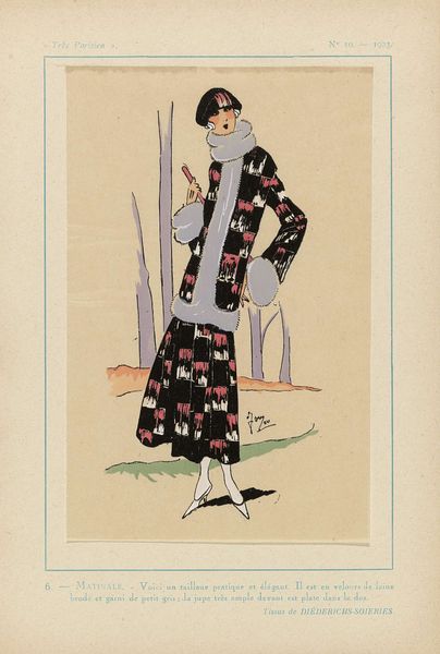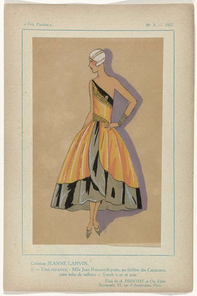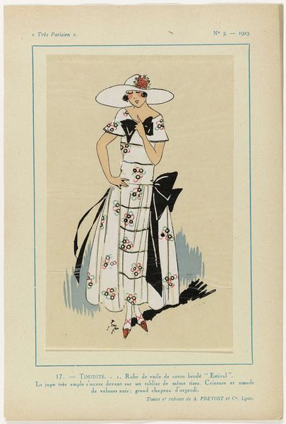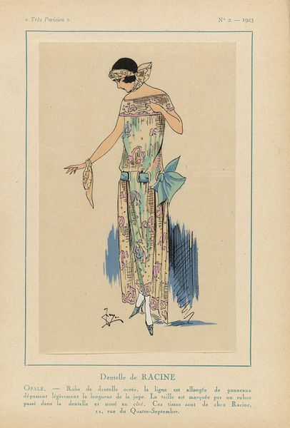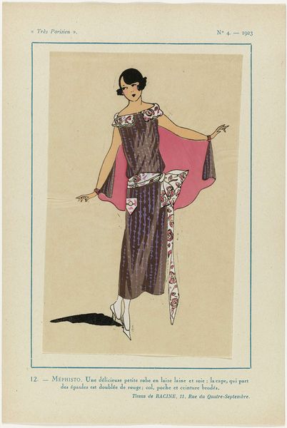 This fashion plate, titled 'Très Parisien, 1923, No 5' is from an unknown artist, and I’m guessing it's made with some kind of printmaking technique. It's got this delicate, almost stenciled effect, like a process of layering colors and shapes to create this flapper dream. I am drawn to the way the dress is rendered, the way the artist suggests texture and form with minimal means, and the way the light lavender acts as a grounding to the more fanciful decorative aspects. It's all about the interplay between line and color, surface and depth, just like building up layers in a painting. There is a mark making at the middle of the dress, where you can see a triangular shape, that almost looks like petals of a flower. It's simple, but it speaks to the idea of fashion as an art form, a way of expressing oneself through color, line, and form. This image reminds me of the work of Erté, a fashion illustrator, he captured the spirit of the Art Deco era, with his elegant designs and bold use of color. Art is just a big conversation, right?