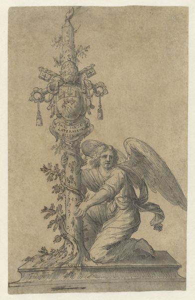 Curator: Our focus now shifts to "Heilige Michael," or "Saint Michael," an engraving rendered in ink around 1488-1492 by the artist known as the Master of the Amsterdam Cabinet. Editor: A powerful image! The dynamism is striking, even in such a small, monochromatic work. The lines seem to vibrate with energy. Curator: Precisely. The artist masterfully employs line work to create depth and texture. Note the contrast between the smooth, flowing lines delineating the angel's drapery and the short, hatched strokes used to depict the demon's grotesque form. The angel, a beacon of idealized beauty, stands in stark opposition to the beast he vanquishes. Editor: Beyond its aesthetic impact, consider the socio-political implications. The depiction of St. Michael triumphing over evil served as potent propaganda. The imagery would have reinforced societal hierarchies and the power of the church, wouldn't it? This print, circulating widely, amplified these messages in ways previously impossible. Curator: Undoubtedly. And observe the symbolic weight embedded within the composition. The angel, armed with both spear and sword, embodies divine authority, literally towering above the grotesque demon, itself a visual shorthand for heresy and social disorder. Look also at the God figure with angels in the upper section of the artwork looking down from above, implying holy blessing upon the character. Editor: The placement of that figure is really telling. The way that authority and hierarchy are structured spatially, too. I think the effectiveness of its propaganda stemmed directly from the ability to transmit such potent symbols widely during a period of rapid change and social unrest. The print’s impact wasn't simply aesthetic. Curator: A critical point. Consider the act of production too. Printmaking facilitated a wider distribution of artistic ideas and themes; It was a new public role of art. What’s left to the viewer is a testament to both spiritual conflict and technological advancement. Editor: It reminds us how visual forms and distribution networks shape societal perceptions of authority and transgression. Thanks, an enlightening artwork to explore through the lenses of composition and cultural force. Curator: Indeed, the marriage of form and context reveals just how powerful visual language can be. Thank you, it's amazing how much impact a pen, ink and printing press can give an artist.