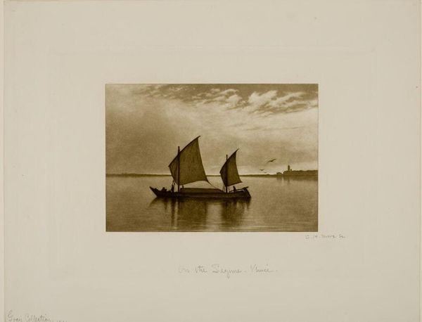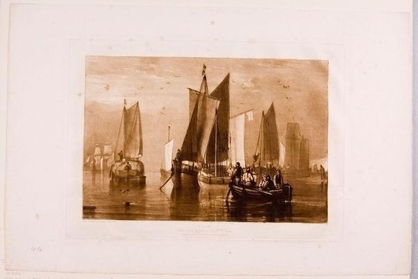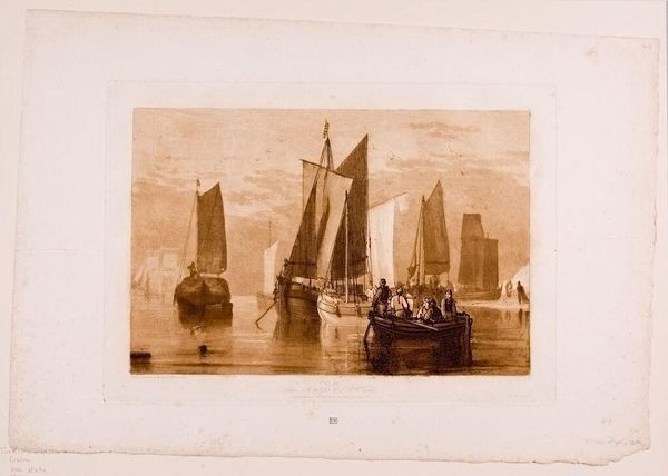 Editor: This is Turner's "Calm," an etching. The monochromatic palette and the subject matter give it a peaceful mood. What can you tell me about it? Curator: Turner’s seascapes are often examined for their sublime qualities, but consider the labor embedded in these scenes. Think of the sailors, the boat builders, the entire infrastructure supporting this coastal life. What materials were used in the printmaking process? How did the distribution of these prints affect Turner's social standing? Editor: I didn't think about the labor aspect. I was so caught up in the aesthetic appeal. It’s a print, so multiple copies could be made and distributed, influencing a wider audience. Curator: Precisely! We can appreciate its artistic merit while also acknowledging the socio-economic systems that enabled its creation and circulation.