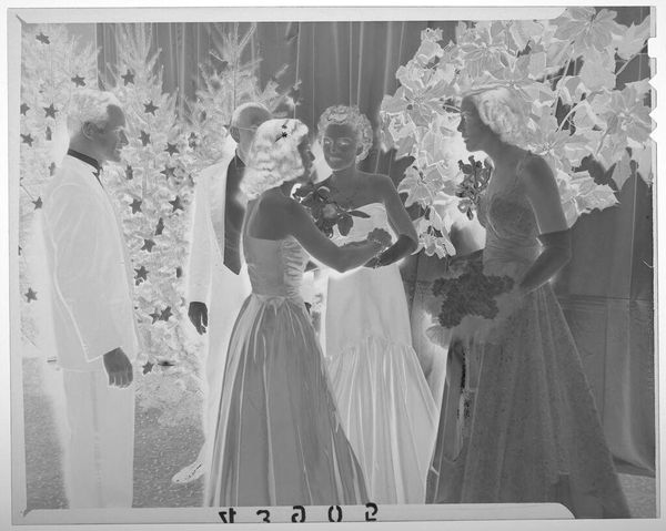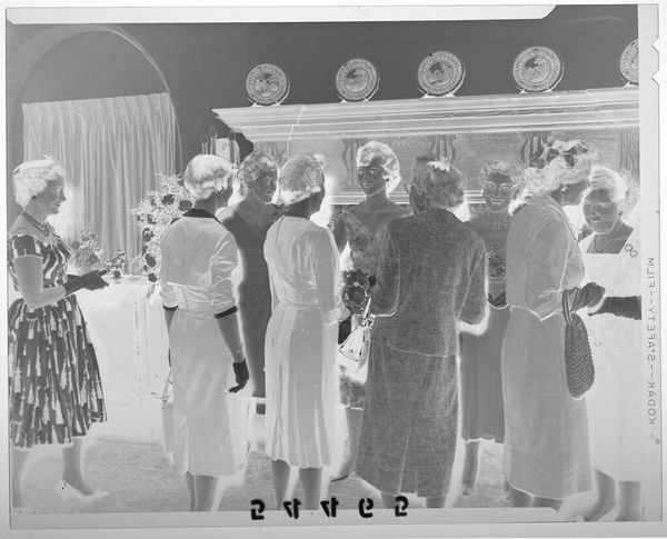 Curator: This photograph, "Untitled (group of women shaking hands in fancy room at party)" by Martin Schweig, captures a social scene. It's part of the Harvard Art Museums collection. Editor: It strikes me as oddly formal. The composition is rigid; everything is so symmetrically arranged, almost staged. Curator: Right, the setting evokes a particular social stratum, doesn't it? The women, the floral arrangements, speak to codes of conduct and belonging. Editor: And the handshake itself, so central. It’s like a structural keystone, uniting opposing visual fields. Curator: Exactly. It reinforces existing power structures and social rituals while seeming like a simple greeting. Editor: I see how the photograph captures a moment laden with underlying meanings, not merely a social nicety. Curator: Yes, it offers a window into the socio-political currents subtly shaping interactions. Editor: A seemingly simple photograph, but brimming with intricate social nuances—quite a find.